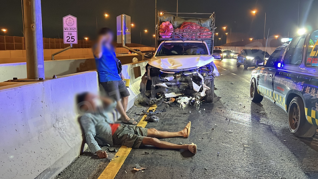 สาววัย 37 ปีขับเก๋งยี่ห้อหรู ย้อนศรกว่า 5 กิโลเมตร ชนประสานงากับรถกระบะ และมีรถได้รับผลกระทบเสียหายกว่า 10 คัน จ.นนทบุรี