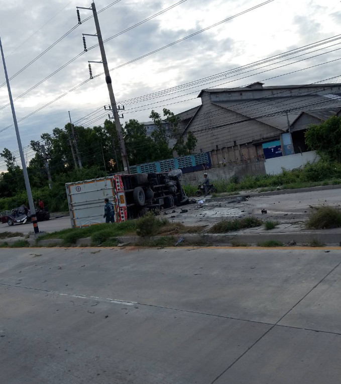 07.19 น. ถนนสุขุมวิท ขาเข้า เลยใต้ทางพิเศษบูรพาวิถีมาเล็กน้อย อุบัติเหตุ รถบรรทุก ชนกับรถกระบะ แล้วรถบรรทุกพลิกตะแคง กีดขวางหมดทุกช่องทาง รถติดหนักมาก #รายงานจราจร #รถติด #อุบัติเหตุ #FM91