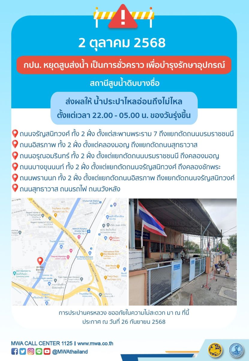 การประปานครหลวง (กปน.) ขอแจ้งให้ทราบว่า จะดำเนินการบำรุงรักษาอุปกรณ์ ในพื้นที่บริเวณสถานีสูบน้ำดิบบางซื่อ เพื่อให้ประชาชนได้รับบริการน้ำประปาอย่างเพียงพอและทั่วถึง จึงมีความจำเป็นต้องหยุดสูบส่งน้ำ สถานีสูบน้ำดิบบางซื่อ เป็นการชั่วคราว ในคืนวันพฤหัสบดีที่ 2 ตุลาคม 2568 ตั้งแต่เวลา 22.00 - 05.00 น. ของวันรุ่งขึ้น โดยระหว่างดำเนินการ ส่งผลให้ น้ำประปาไหลอ่อนถึงไม่ไหล ในพื้นที่ดังต่อไปนี้