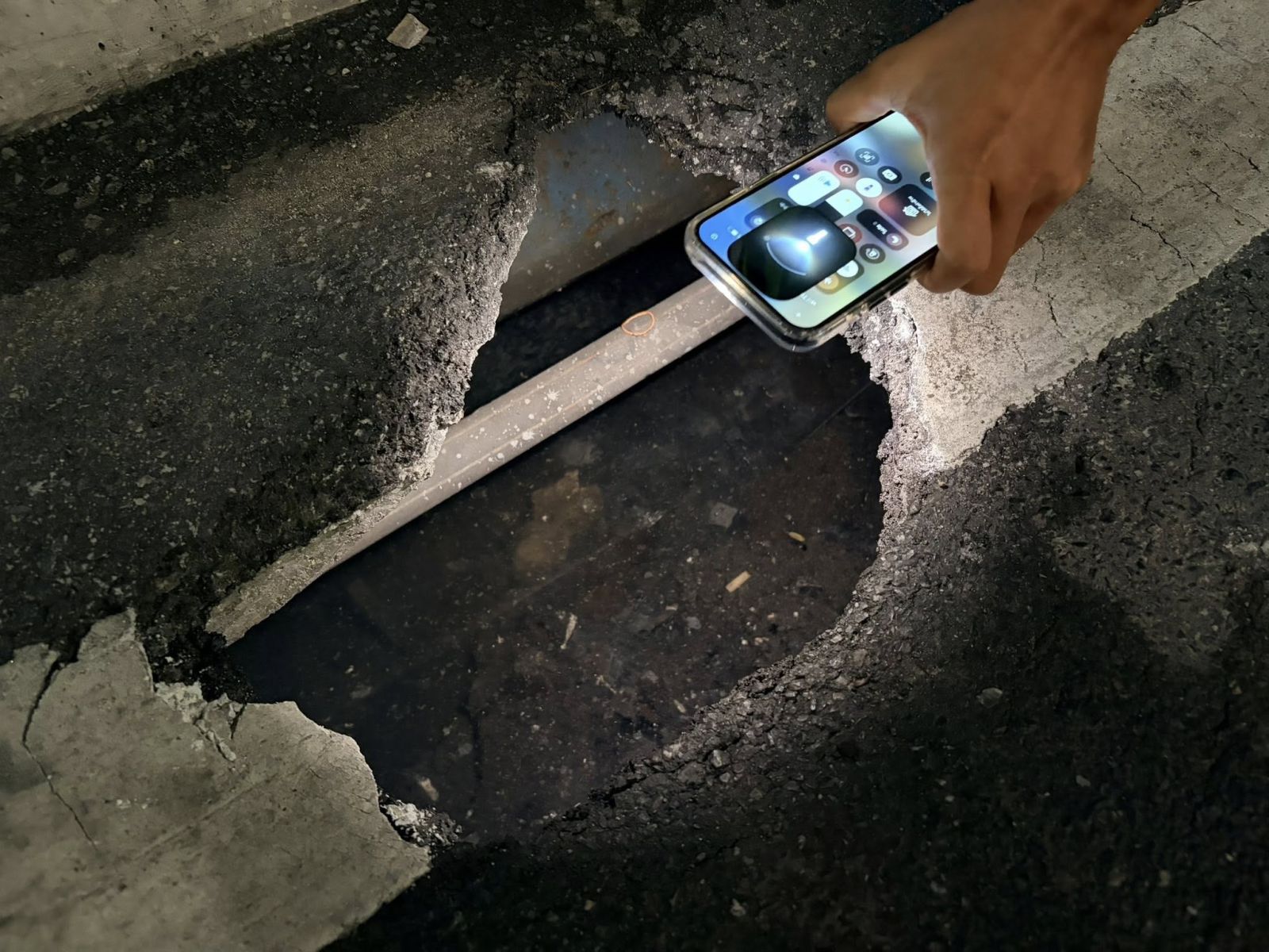 พบหลุมลึกประมาณ 70 ซม. กว้าง 40 ซม. สาเหตุเบื้องต้นอาจเกิดจากการกัดเซาะดิน เนื่องจากอยู่บริเวณแนวท่อระบายน้ำ