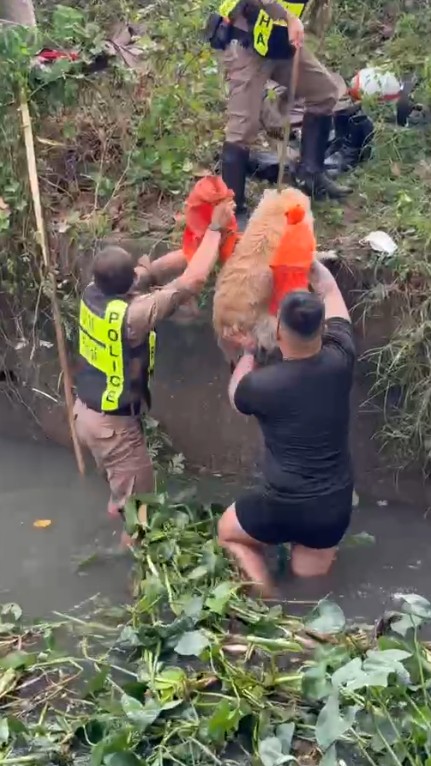 ตำรวจจราจรวิภาวดีจึงรีบลงพื้นที่เข้าช่วยเหลืออย่างไม่รอช้า สามารถนำตัวน้องขึ้นมาจากน้ำได้อย่างปลอดภัย พร้อมทั้งดูแลทำความสะอาดให้น้องอย่างอบอุ่น ขณะนี้เจ้าหน้าที่ได้ดูแลน้องไว้เป็นอย่างดี และเตรียม ประกาศตามหาเจ้าของที่แท้จริง มารับกลับบ้าน