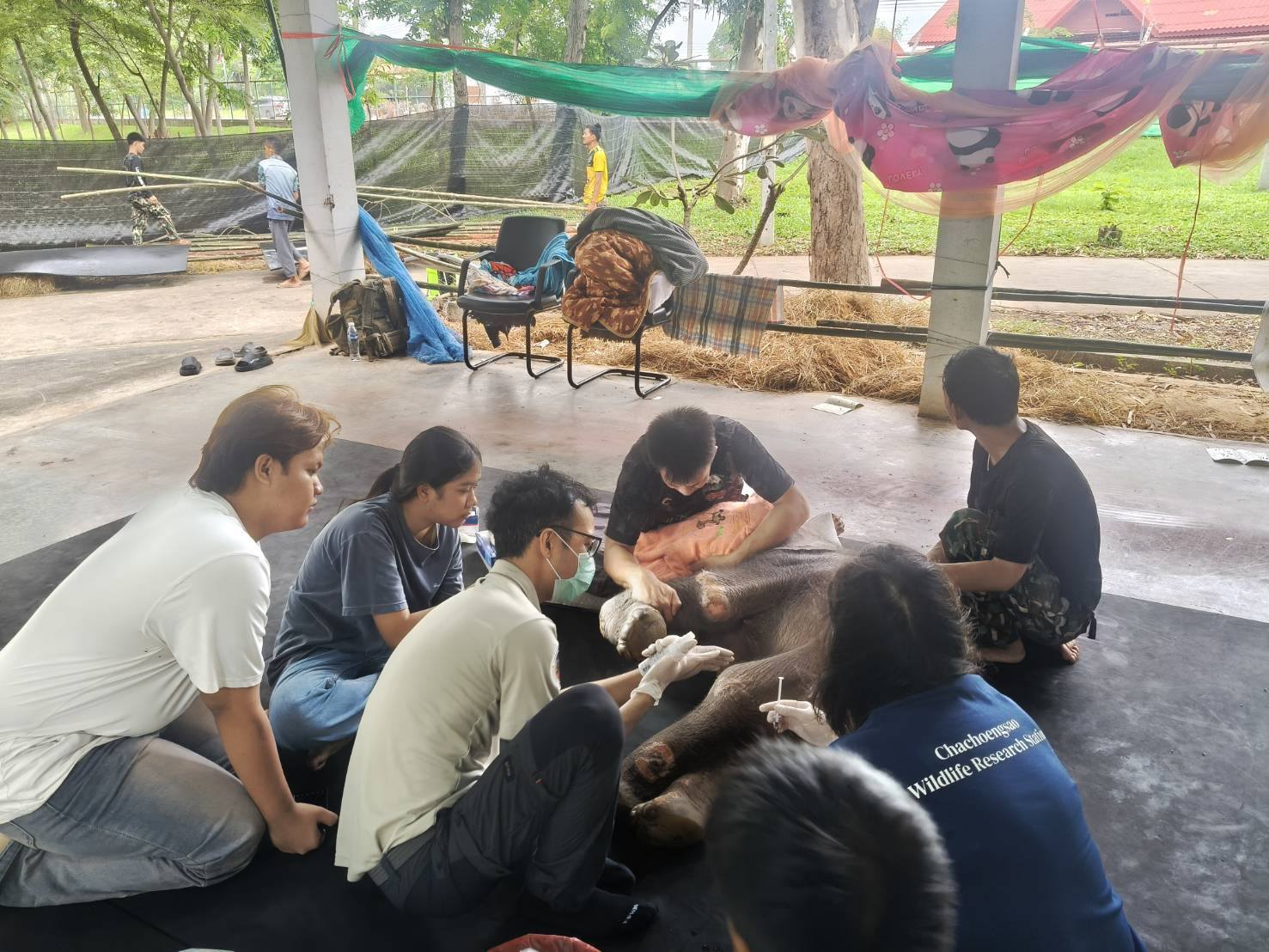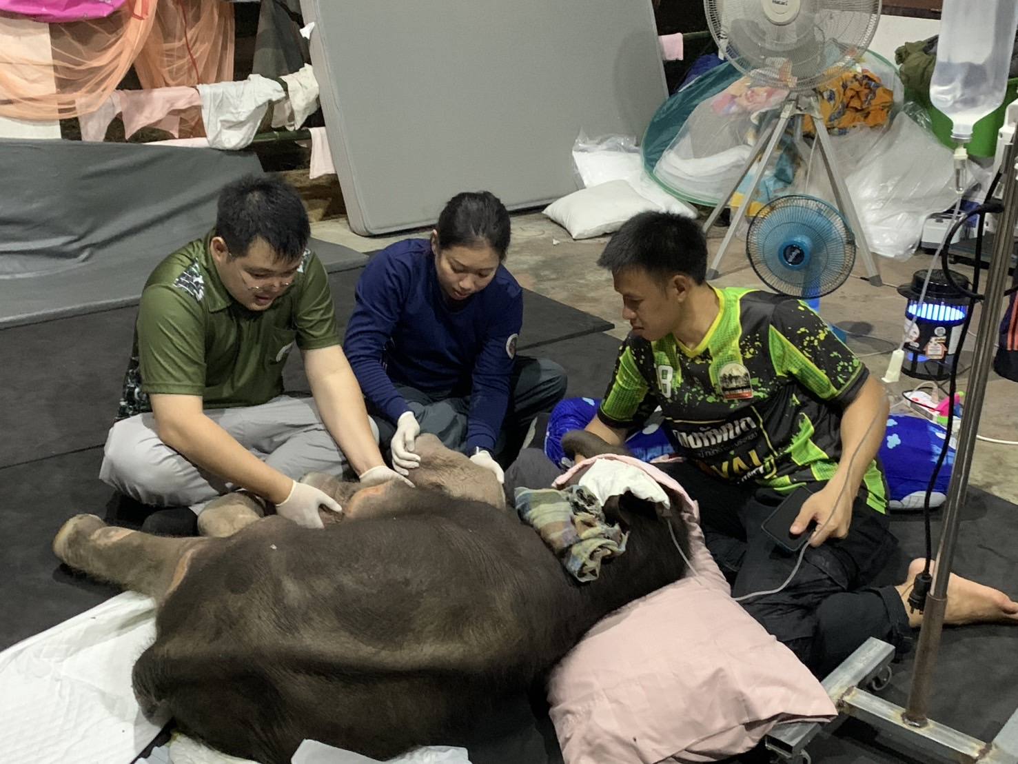 ทีมสัตวแพทย์เน้นย้ำการบำบัดฟื้นฟูอย่างเข้มข้น โดยมีการนวดกระตุ้นกล้ามเนื้อและยืดเหยียดขาอย่างต่อเนื่อง พร้อมทั้งให้สารน้ำทางหลอดเลือดดำ และให้โปรไบโอติกเพื่อปรับสมดุลในระบบทางเดินอาหาร เพื่อเร่งให้ลูกช้างสามารถช่วยเหลือตัวเองได้มากขึ้น