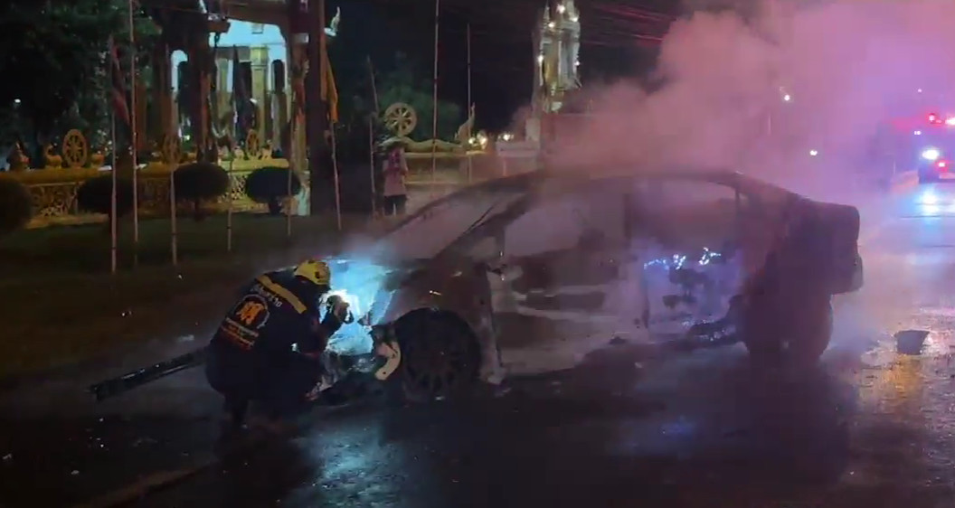 รถเก๋งเสียหลักชนเสาไฟ แล้วเกิดเพลิงไหม้ กลางถนนเพชรเกษม เสียหายวอดทั้งคัน จ.เพชรบุรี