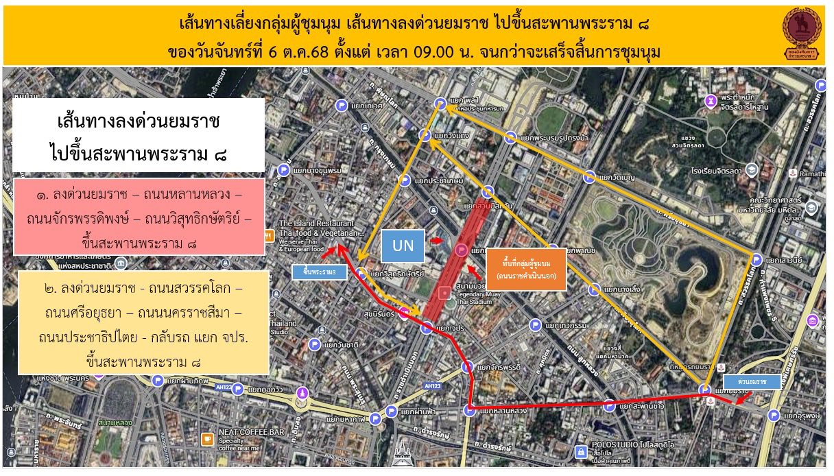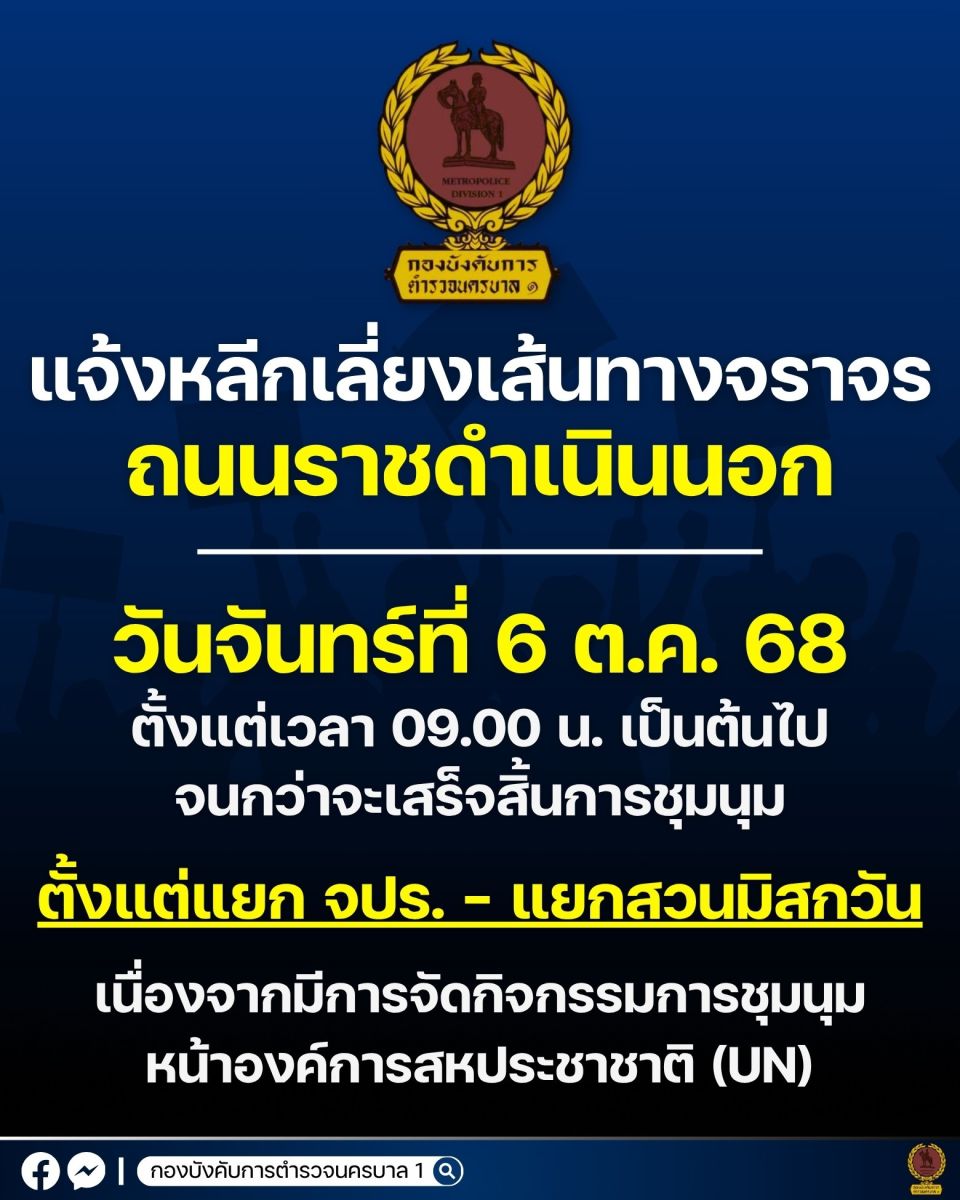 ในวันจันทร์ที่ 6 ตุลาคม 2568 ตั้งแต่เวลา 09.00 น. เป็นต้นไป จนกว่าจะเสร็จสิ้นการชุมนุม ขอให้ประชาชน หลีกเลี่ยงถนนราชดำเนินนอก ตั้งแต่แยก จปร. ถึง แยก สวนมิสกวัน