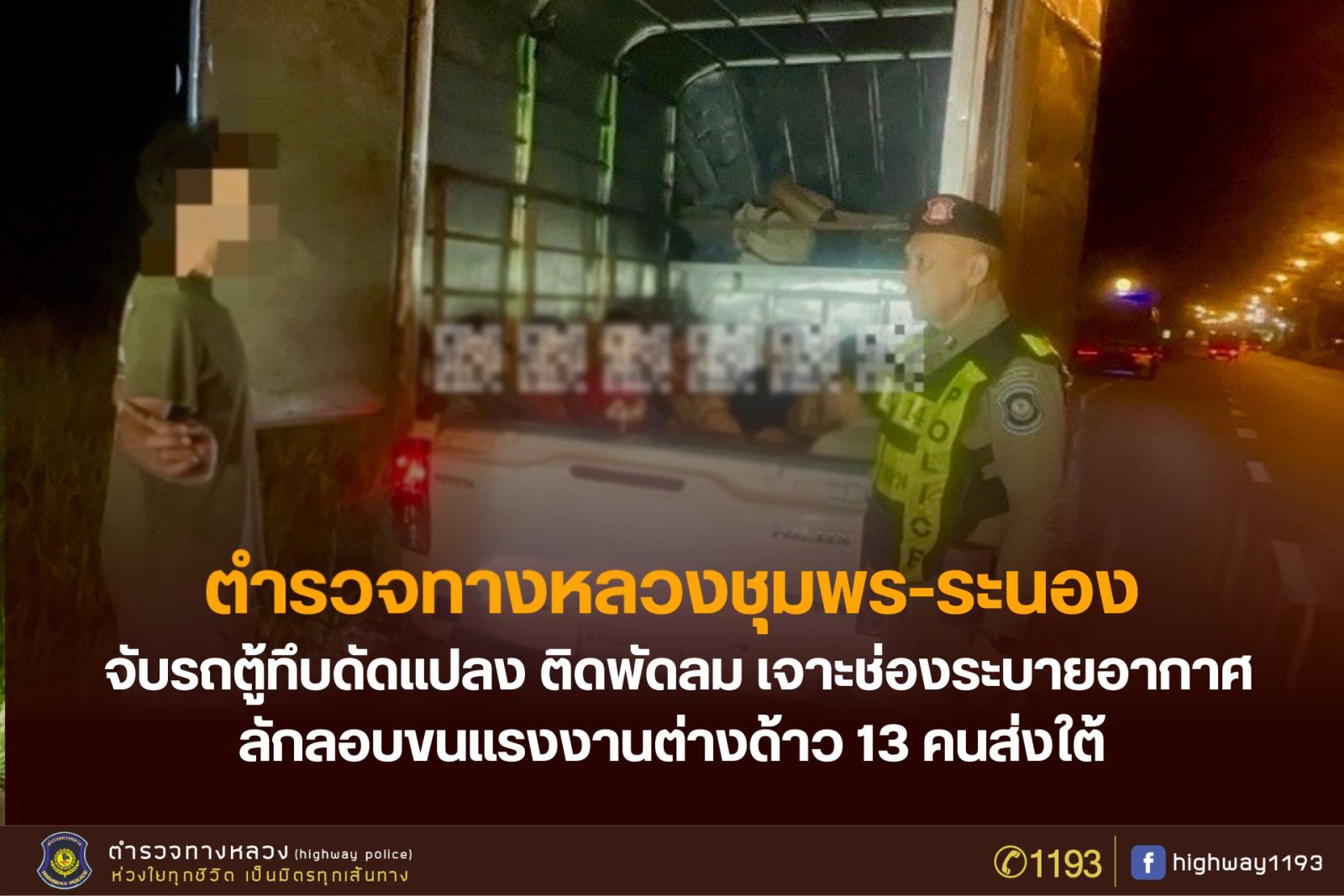 เมื่อขอตรวจค้นภายใน พบแรงงานต่างด้าวชาวเมียนมา 13 คน เป็นเพศชายทั้งหมด นั่งอัดแน่นอยู่ในตู้ทึบ โดยไม่มีใบอนุญาตฯ ขณะเดียวกันภายในตู้ถูกดัดแปลง มีช่องระบายอากาศและพัดลมขนาดเล็กติดตั้งไว้ คาดว่าทำขึ้นเพื่ออำพรางการลักลอบขนแรงงานระยะไกล