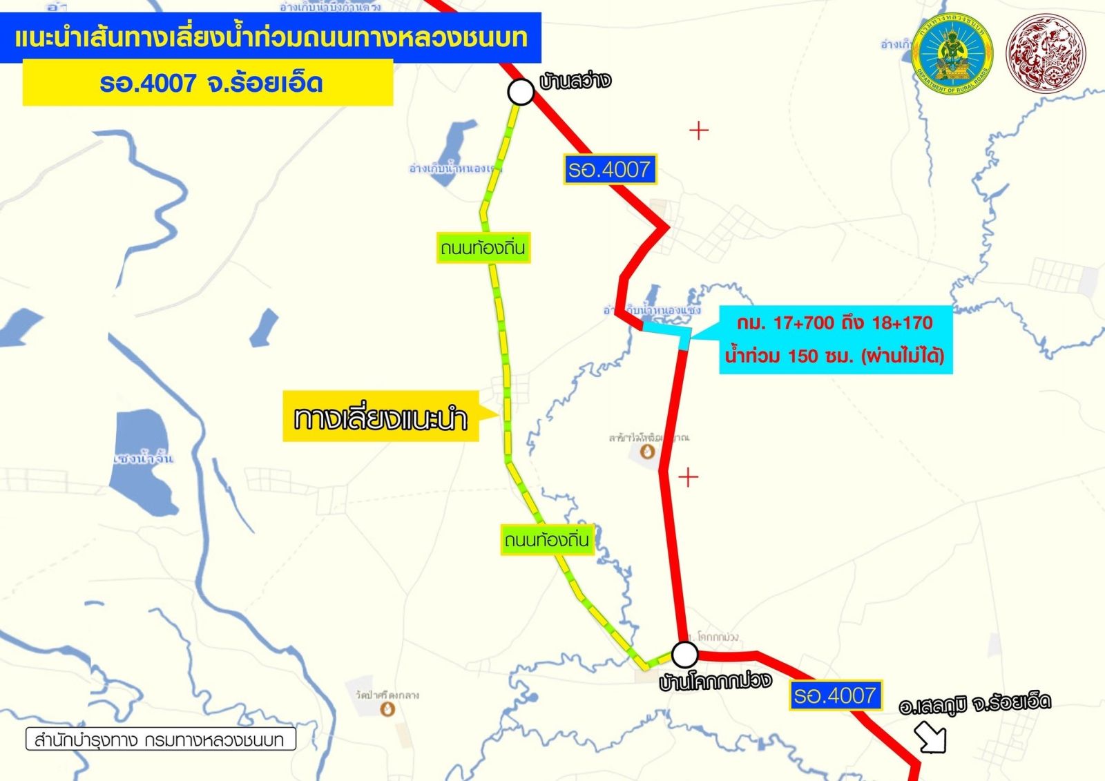 1. ถนนทางหลวงชนบทสาย รอ.4007 แยก ทล.2259 (กม.ที่ 19+400) - บ้านสว่าง อ.เสลภูมิ, โพนทอง จ.ร้อยเอ็ด ซึ่งหากต้องการเดินผ่านบริเวณน้ำท่วมให้ผู้ใช้ทางเลี้ยวบริเวณบ้านโคกกกม่วงพัฒนา (ถนนทางหลวงชนบทสาย รอ.4007 กม.ที่ 14+500) ขับบนถนน อบจ. ไปยังบ้านคำอุปราช และเข้ายังตำบลสว่าง ระยะทาง 7.200 กิโลเมตร จะสามารถเดินทางกลับมายังถนนทางหลวงชนบทสาย รอ.4007 (กม.ที่ 22+000)