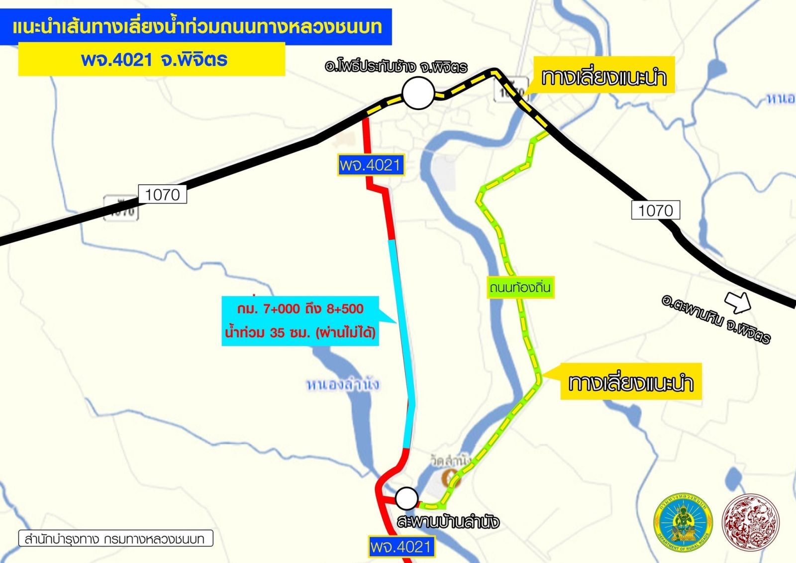4. ถนนทางหลวงชนบทสาย พจ.4011 แยก ทล.1289 (กม.ที่ 10+900) - บ้านทุ่งอ่างทอง อ.โพทะเล จ.พิจิตร ซึ่งหากต้องการเดินทางไป อำเภอโพทะเล วิ่งบน ทล.1289 ไปอีก 5 กิโลเมตร เลี้ยวซ้ายเข้าถนนทางหลวงชนบทสาย พจ.4042 แยก ทล.1289 บ้านท้ายน้ำ หากต้องการข้ามผ่านบริเวณน้ำท่วม ให้ผู้ใช้รถใช้ถนนเดินทางย้อนมุ่งหน้าเข้าถนนทางหลวงชนบทสาย พจ.4011 เดินทางไปอำเภอโพทะเล และหลีกเลี่ยงบริเวณน้ำท่วมได้