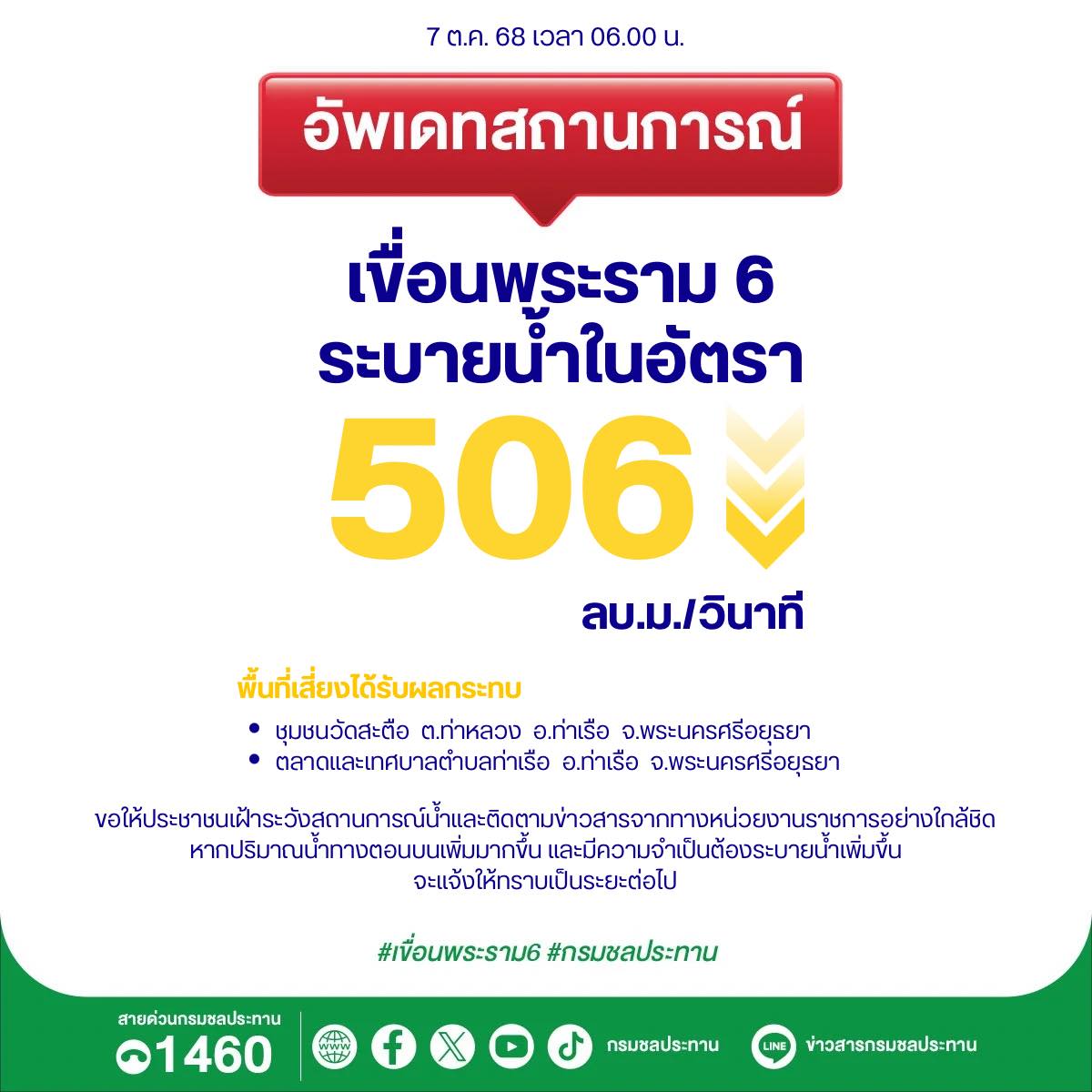 เขื่อนพระราม6 อ.ท่าเรือ จ. พระนครศรีอยุธยา ระบายน้ำในอัตรา 506 ลบ.ม./วินาที