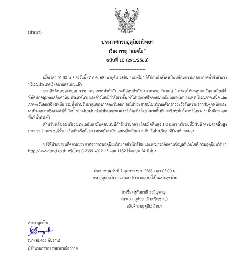 เมื่อเวลา 01.00 น. ของวันนี้ (7 ต.ค. 68) พายุดีเปรสชัน “แมตโม” ได้อ่อนกำลังลงเป็นหย่อมความกดอากาศต่ำกำลังแรง บริเวณประเทศเวียดนามตอนบนแล้ว จากอิทธิพลของหย่อมความกดอากาศต่ำกำลังแรงที่อ่อนกำลังลงจากพายุ “แมตโม” ส่งผลให้มรสุมตะวันตกเฉียงใต้ที่พัดปกคลุมทะเลอันดามัน ประเทศไทย และอ่าวไทยมีกำลังแรงขึ้น ทำให้ประเทศไทยตอนบนมีฝนตกหนักบางแห่งบริเวณภาคเหนือ และภาคตะวันออกเฉียงเหนือ รวมทั้งด้านรับมรสุมของภาคตะวันออก ขอให้ประชาชนในบริเวณดังกล่าวระวังอันตรายจากฝนตกหนักและฝนที่ตกสะสมซึ่งอาจทำให้เกิดน้ำท่วมฉับพลัน น้ำป่าไหลหลาก และน้ำล้นตลิ่ง โดยเฉพาะพื้นที่ลาดเชิงเขาใกล้ทางน้ำไหลผ่าน พื้นที่ลุ่ม และพื้นที่น้ำท่วมขัง