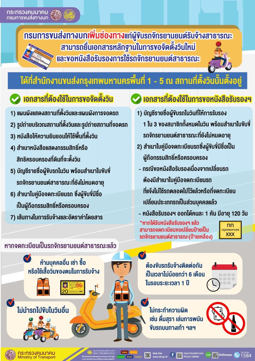 นายเสกสม อัครพันธุ์ รองอธิบดีกรมการขนส่งทางบก เปิดเผยว่า กรมการขนส่งทางบกอำนวยความสะดวก และเพิ่มช่องทางให้แก่ผู้ขับรถจักรยานยนต์รับจ้างสาธารณะ (มอเตอร์ไซค์วิน) สามารถยื่นเอกสารหลักฐานในการขอจัดตั้งวินใหม่ และขอหนังสือรับรองการใช้รถจักรยานยนต์สาธารณะได้ทั้งที่สำนักงานเขต ในสังกัดกรุงเทพมหานคร และสำนักงานขนส่งกรุงเทพมหานครพื้นที่ 1 -5 ณ สถานที่ตั้งวินนั้นตั้งอยู่ ซึ่งกรมฯ จะรวบรวมเอกสารหลักฐานส่งให้ประธานคณะอนุกรรมการประจำกรุงเทพมหานครในเขตความรับผิดชอบเพื่อพิจารณา หากได้รับหนังสือรับรองการใช้รถจักรยานยนต์สาธารณะเรียบร้อยแล้ว สามารถดำเนินการจดทะเบียนขอเปลี่ยนป้ายเป็นรถจักรยานยนต์สาธารณะ (ป้ายเหลือง) ได้ ณ สำนักงานขนส่งพื้นที่ที่สถานที่ตั้งวินที่ผู้นั้นขับรถอยู่ โดยหลังจากจดทะเบียนเป็นรถจักรยานยนต์สาธารณะแล้ว ต้องไม่ให้บุคคลอื่น เช่า ซื้อ หรือใช้เสื้อวินของตนในการรับจ้าง และจะต้องขับรถรับจ้างติดต่อกันเป็นเวลาไม่น้อยกว่า 6 เดือน ในรอบระยะเวลา 1 ปี ต้องไม่นำรถจักรยานยนต์สาธารณะของตนไปรับจ้างในสถานที่ตั้งวินอื่นที่ตนเองไม่มีชื่ออยู่ในบัญชีรายชื่อผู้ขับรถ รวมถึงต้องไม่ประพฤติตนไม่เหมาะสมหรือกระทำความผิด เช่น ดื่มสุรา เล่นการพนัน ขับรถบนทางเท้า ฯลฯ หากฝ่าฝืนคณะอนุกรรมการฯ จะพิจารณายกเลิกหนังสือรับรองการใช้รถจักรยานยนต์สาธารณะ หรือพิจารณาถอนรายชื่อออกจากบัญชีรายชื่อวินรถจักรยานยนต์สาธารณะ