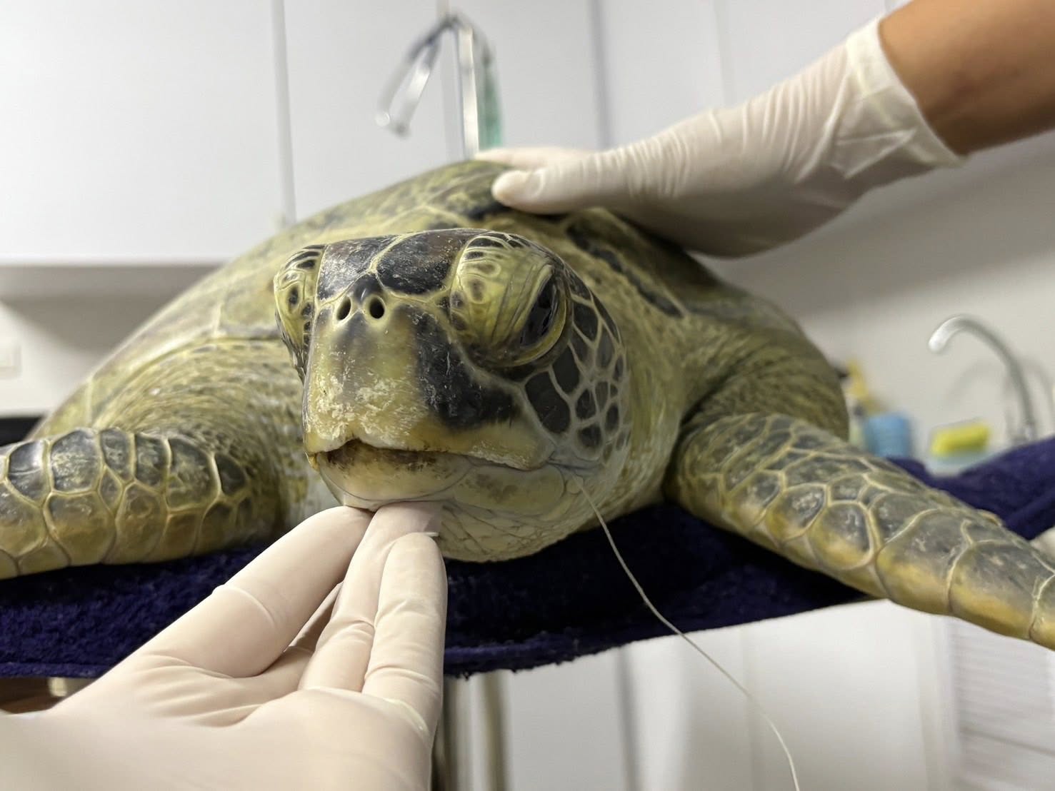 จากนั้นสัตวแพทย์ได้พิจารณาทำการวางยาซึมและนำเบ็ดตกปลาออกโดยทันที ซึ่งสามารถนำตะขอเบ็ดออกได้ด้วยดี โดยได้ให้การรักษาและอนุบาลพักฟื้น ณ ศูนย์ช่วยชีวิตสัตว์ทะเลหายากสิรีธาร ศวอบ. เพื่อฟื้นฟสุขภาพก่อนจะปล่อยกลับสู่ธรรมชาติต่อไป