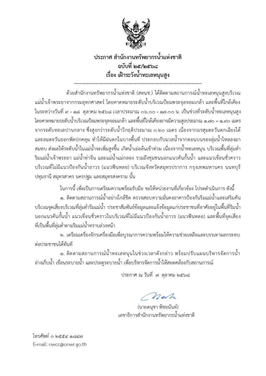 สำนักงานทรัพยากรน้ำแห่งชาติ (สทนช.) ได้ติดตามสถานการณ์น้ำทะเลหนุนสูงบริเวณแม่น้ำเจ้าพระยาจากกรมอุทกศาสตร์ โดยคาดหมายระดับน้ำบริเวณป้อมพระจุลจอมเกล้า และพื้นที่ใกล้เคียง ในระหว่างวันที่ 9 - 18 ตุลาคม 2568 เวลาประมาณ 06.00 - 17.00 น. เป็นช่วงที่ระดับน้ำทะเลหนุนสูง โดยคาดหมายระดับน้ำบริเวณป้อมพระจุลจอมเกล้า และพื้นที่ใกล้เคียงอาจมีความสูงประมาณ 1.70 – 1.90 เมตรจากระดับทะเลปานกลาง ซึ่งสูงกว่าระดับน้ำวิกฤติประมาณ 0.20 เมตร เนื่องจากมรสุมตะวันตกเฉียงใต้