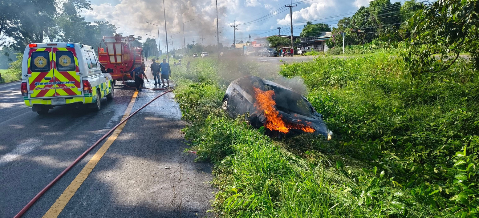 รถเก๋งเสียหลักตกข้างทางแล้วเพลิงลุกไหม้วอดทั้งคัน ริมถนนหมายเลข 24 คนขับรอดหวุดหวิด บาดเจ็บไม่สาหัส อาสาฯ นำส่ง รพ.