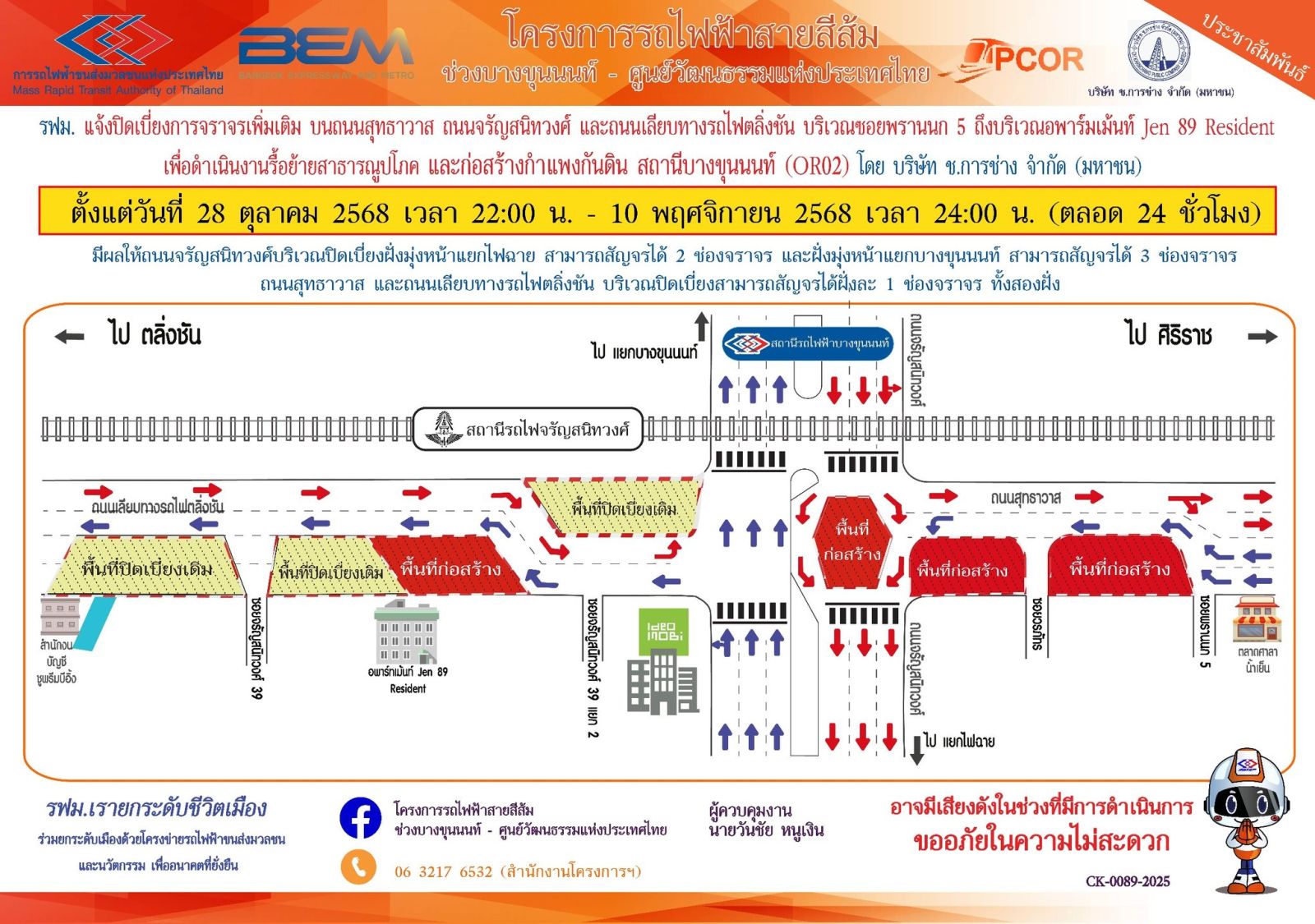 โครงการรถไฟฟ้าสายสีส้ม ช่วงบางขุนนนท์ - ศูนย์วัฒนธรรมแห่งประเทศไทย ตั้งแต่วันที่ 28 ตุลาคม 2568 เวลา 22:00 น. – 25 พฤศจิกายน 2568 เวลา 24:00 น. (ตลอด 24 ชั่วโมง)
