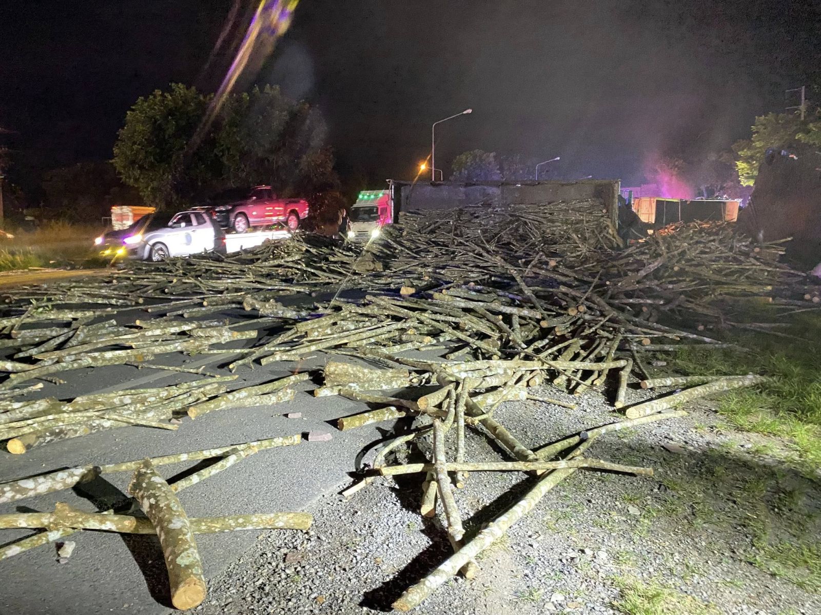 ที่เกิดเหตุ พบรถบรรทุก 10 ล้อ พลิกตะแคงอยู่ข้างทาง และใกล้กันพบรถพ่วง ป้ายทะเบียน นครราชสีมา พลิกตะแคงและมีท่อนไม้ตกเกลื่อนถนน