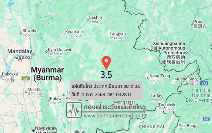 วันที่ 11 ต.ค. 2568 เวลา 03.28 น. กองเฝ้าระวังแผ่นดินไหว กรมอุตุนิยมวิทยา แจ้งเหตุแผ่นดินไหว ขนาด 3.5 ความลึก 10 กม. ภายในพื้นที่ของประเทศเมียนมา ศูนย์กลางห่างออกไปทางทิศตะวันตกเฉียงเหนือของ อ.ฝาง จ.เชียงใหม่ ประมาณ 199 กม. ยังไม่มีรายงานผลกระทบต่อประเทศไทย