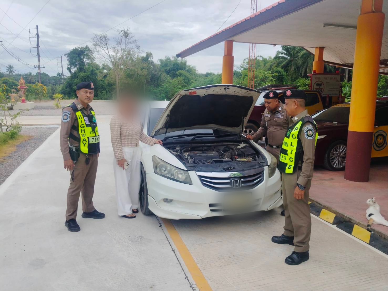 ออกตรวจพื้นที่รับผิดชอบมาถึงถนนที่เกิดเหตุพบ พบผู้ขับขี่รถยนต์เก๋ง ยี่ห้อ ฮอนด้า รุ่นแอคคอร์ด สีขาว ลักษณะมีพิรุธต้องสงสัย จึงส่งสัญญาณให้หยุดรถเพื่อขอทำการตรวจสอบ ผลการตรวจสอบ มี น.ส.ปลา (นามสมมุติ) แสดงตัวเป็นผู้ขับขี่ เจ้าหน้าที่ตำรวจได้ขอตรวจสอบใบอนุญาตขับขี่และสำเนาคู่มือการจดทะเบียนรถ น.ส.ปลา (นามสมมุติ) ไม่มีเอกสารสำเนาคู่มือจดทะเบียนมาแสดง ผลการตรวจสอบข้อมูลแผ่นป้ายทะเบียนรถและเครื่องหมายแสดงการเสียภาษีประจำปี พบว่าไม่มีตำหนิสำคัญตามที่กรมการขนส่งทางบกกำหนด อีกทั้งเมื่อตรวจสอบข้อมูลจาจากหมายเลขตัวถัง และหมายเลขเครื่องยนต์ พบว่าตรงกับรถยนต์ที่จดทะเบียนไว้กับรถอีกคันหนึ่ง จึงเชื่อได้ว่าแผ่นป้ายทะเบียนและเครื่องหมายแสดงการเสียภาษีประจำปีของกลางได้ทำปลอมขึ้นทั้งฉบับจริง จึงได้แจ้งสิทธิ์และข้อกล่าวหาให้ทราบ