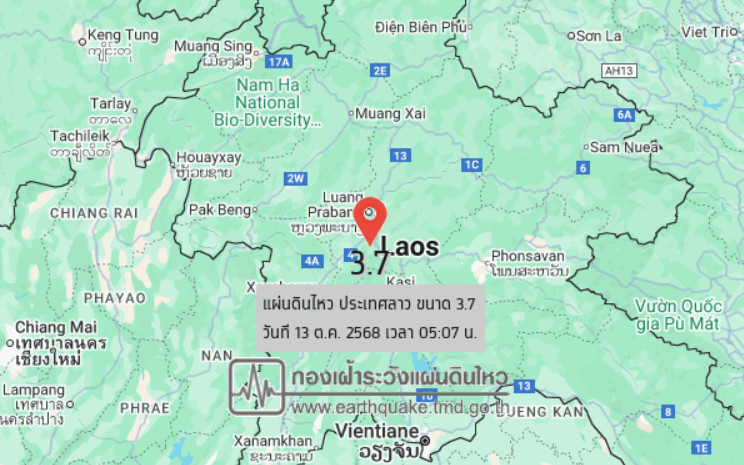 วันที่ 13 ต.ค. 2568 เวลา 05:07 น. กองเฝ้าระวังแผ่นดินไหว กรมอุตุนิยมวิทยา แจ้งเหตุแผ่นดินไหว ขนาด 3.7 ลึก 10 กม. ภายในพื้นที่ของประเทศลาว ศูนย์กลางห่างออกไปทางทิศตะวันออกเฉียงเหนือของ บ้านน้ำช้าง ต.ขุนน่าน อ.เฉลิมพระเกียรติ จ.น่าน ประมาณ 99 กม. ยังไม่มีรายงานผลกระทบต่อประเทศไทย