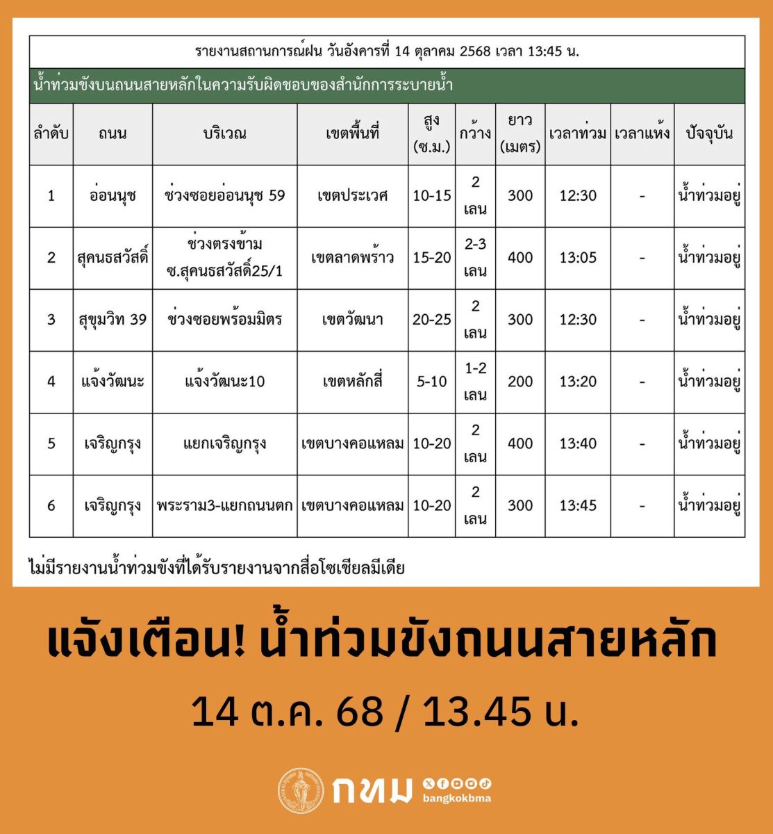 14 ตุลาคม 2568 หลังฝนตกลงมาอย่างต่อเนื่องในช่วงบ่าย เจ้าหน้าที่และหน่วยงานที่เกี่ยวข้องเร่งระบายน้ำในทุกจุด เพจ กรุงเทพมหานคร โพสต์ข้อความระบุ "แจ้งเตือนจุดน้ำท่วมถนน เวลา 13.45 น. ทั้งนี้ เจ้าหน้าที่กำลังเร่งระบายน้ำทุกจุด