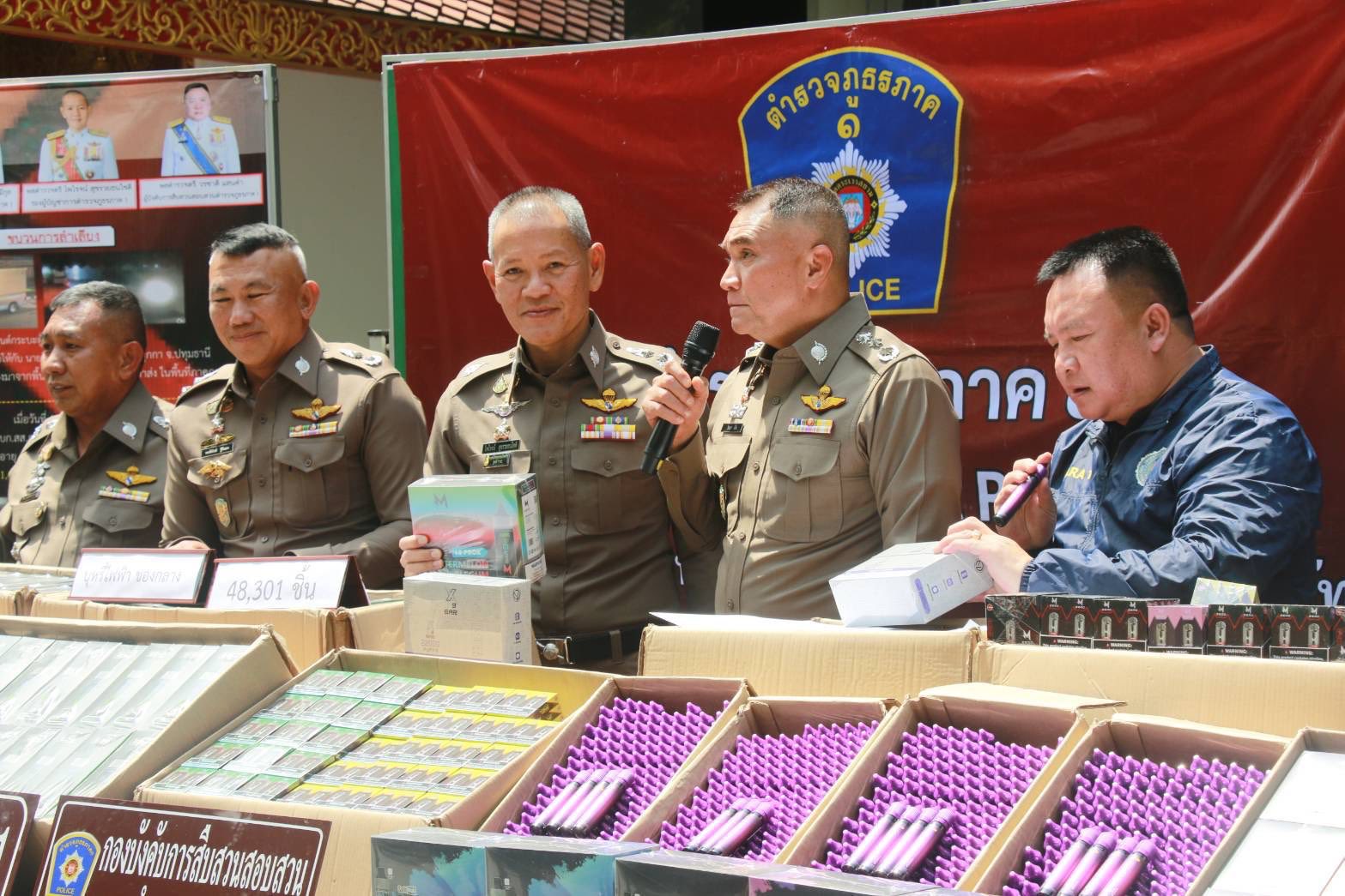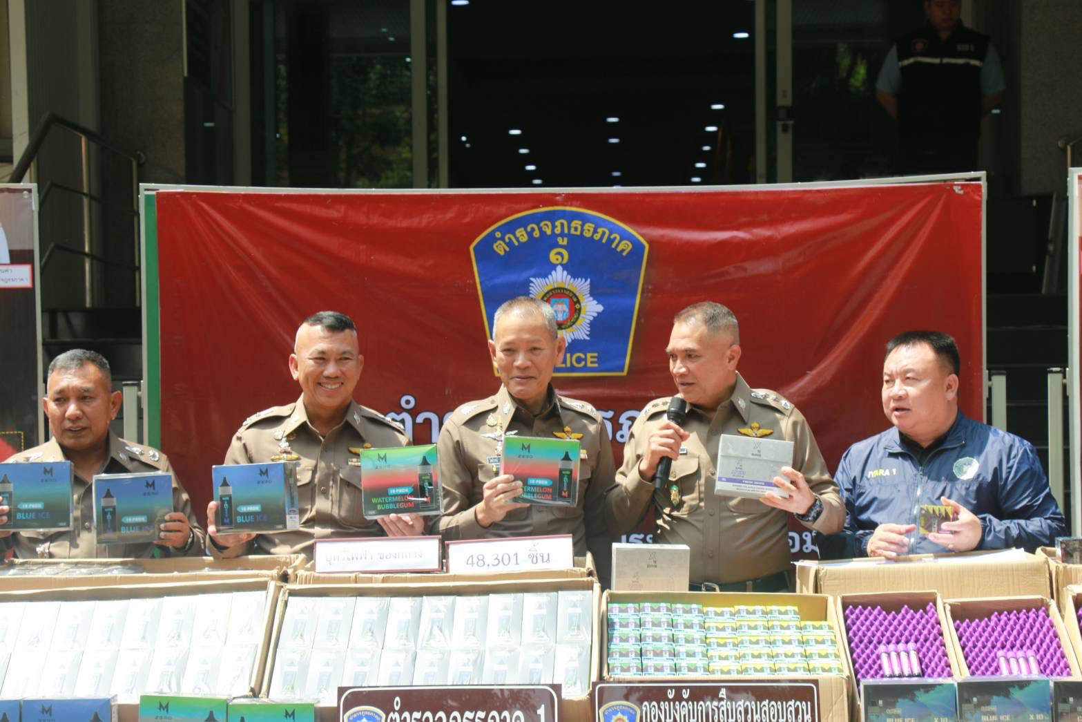 ที่ บช.ภ.1 พล.ต.ท.วัฒนา ยี่จีน ผบช.ภ.1 , พล.ต.ต.วิชิต บุญชินวุฒิกุล รอง ผบช.ภ.1 , พล.ต.ต.วรชาติ แสนคำ ผบก.สส.ภ.1 , พ.ต.อ.พูนสุข เตชะประเสริฐ์พร ผกก.1 บก.สส.ภ.1 ร่วมกันแถลงข่าวจับกุม นายมู (นามสมมุติ) อายุ 23 ปี และนายอู (นามสมมุติ) อายุ 28 ปี พร้อมของกลาง บุหรี่ไฟฟ้า จำนวน 48,301 ชิ้น รถกระบะโตโยต้า 2 คัน โทรศัพท์มือถือ 4 เครื่อง