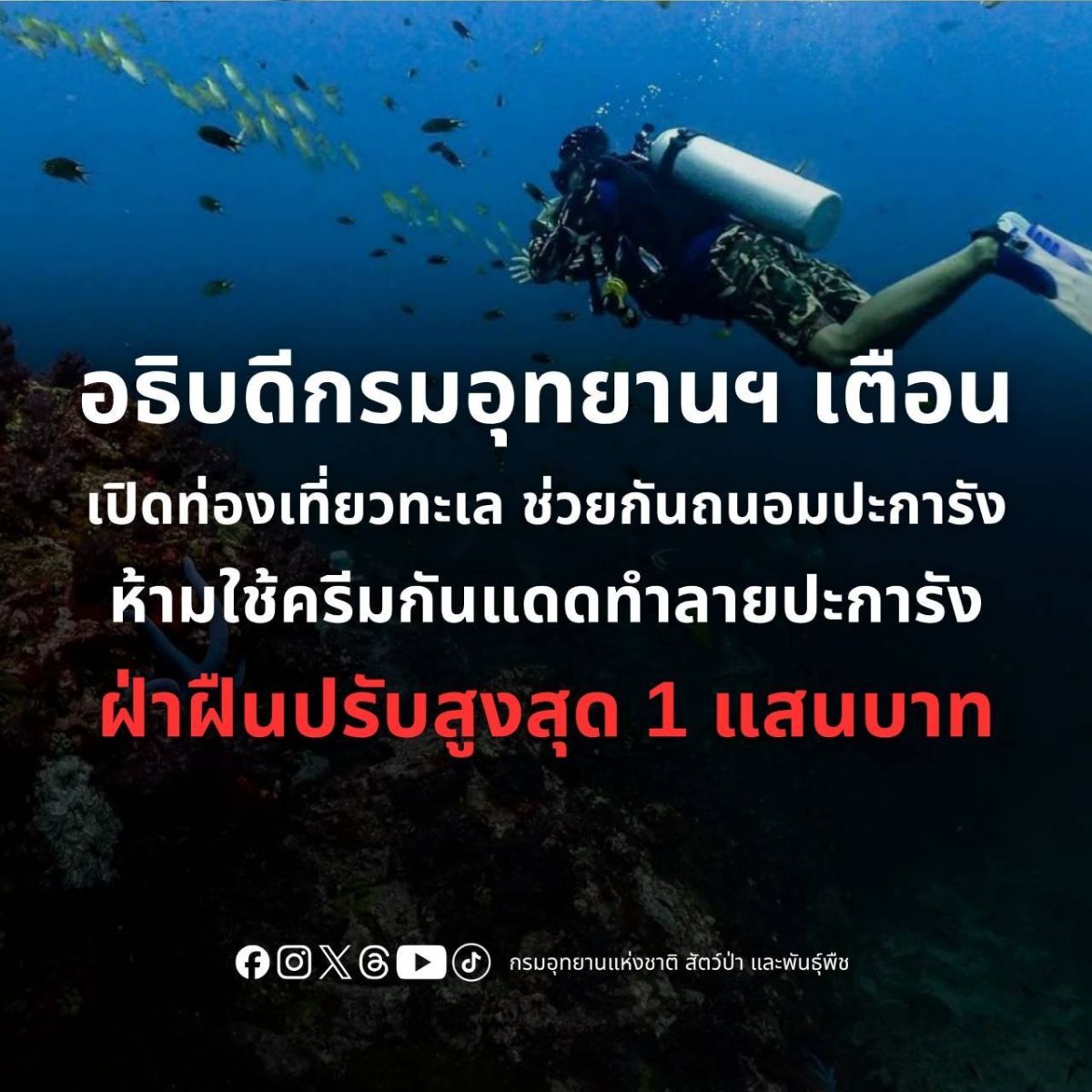 กรมอุทยานแห่งชาติ สัตว์ป่า และพันธุ์พืช ออกประกาศเตือนนักท่องเที่ยวที่เดินทางไปยังอุทยานแห่งชาติทางทะเล ให้งดใช้ครีมกันแดดที่มีสารเคมีอันตรายต่อปะการัง หากฝ่าฝืนมีโทษปรับไม่เกิน 100,000 บาท เพื่อป้องกันการทำลายระบบนิเวศทางทะเลในระยะยาว