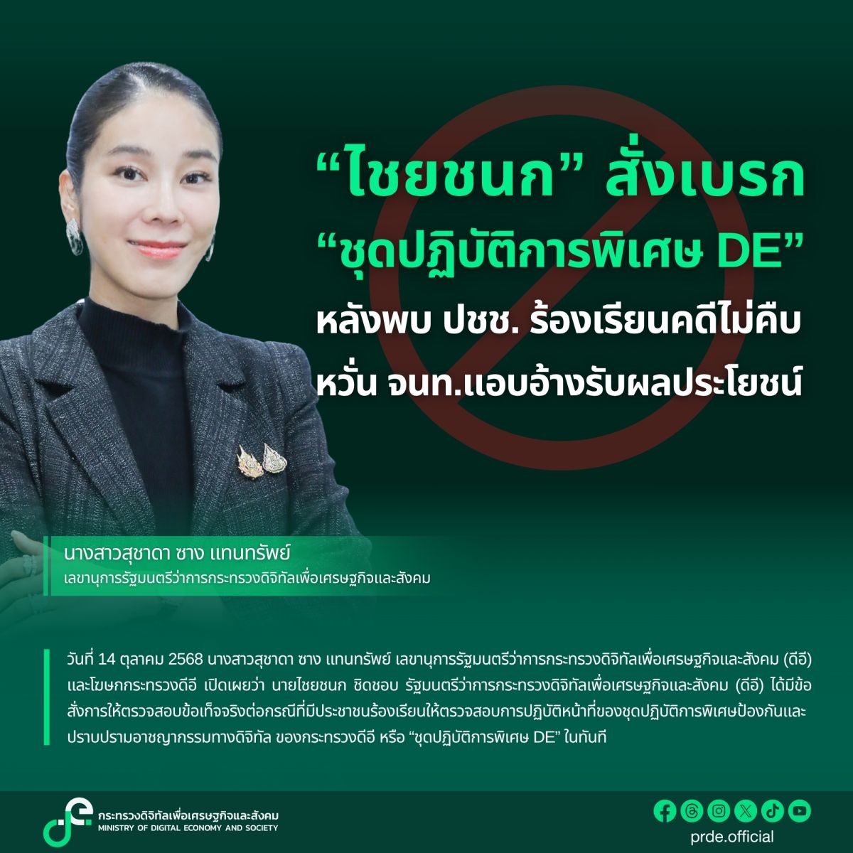 วันที่ 14 ตุลาคม 2568 นางสาวสุชาดา ซาง แทนทรัพย์ เลขานุการรัฐมนตรีว่าการกระทรวงดิจิทัลเพื่อเศรษฐกิจและสังคม (ดีอี) และโฆษกกระทรวงดีอี เปิดเผยว่า นายไชยชนก ชิดชอบ รัฐมนตรีว่าการกระทรวงดิจิทัลเพื่อเศรษฐกิจและสังคม (ดีอี) ได้มีข้อสั่งการให้ตรวจสอบข้อเท็จจริงต่อกรณีที่มีประชาชนร้องเรียนให้ตรวจสอบการปฏิบัติหน้าที่ของชุดปฏิบัติการพิเศษป้องกันและปราบปรามอาชญากรรมทางดิจิทัล ของกระทรวงดีอี หรือ “ชุดปฏิบัติการพิเศษ DE” ในทันที