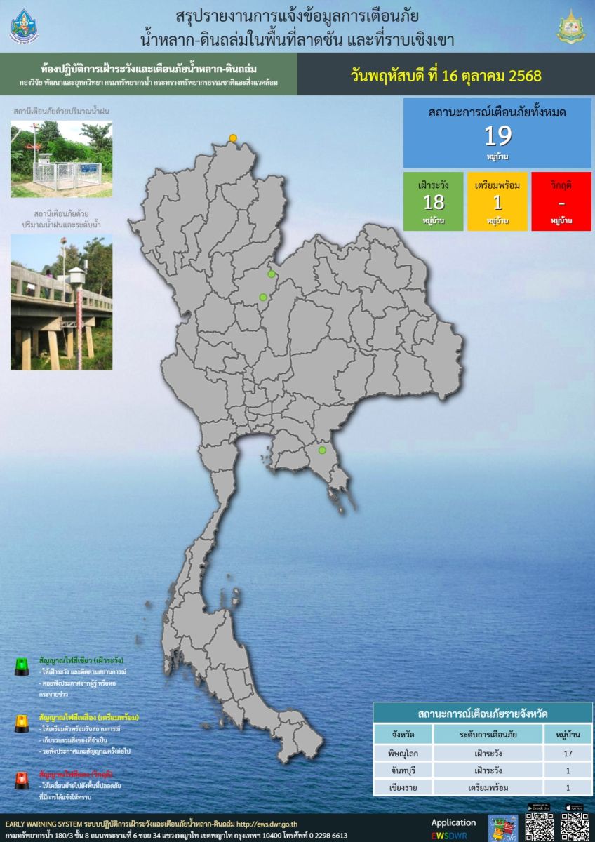 รายงานการเตือนภัยน้ำหลาก-ดินถล่ม ด้วยระบบ Early Warning System วันที่ 16 ตุลาคม 2568 มีการเตือนภัยทั้งสิ้น 19 หมู่บ้าน สามารถดูข้อมูลเพิ่มเติมทาง https://ews.dwr.go.th/ews/index.php หรือapplication: ewsdwr