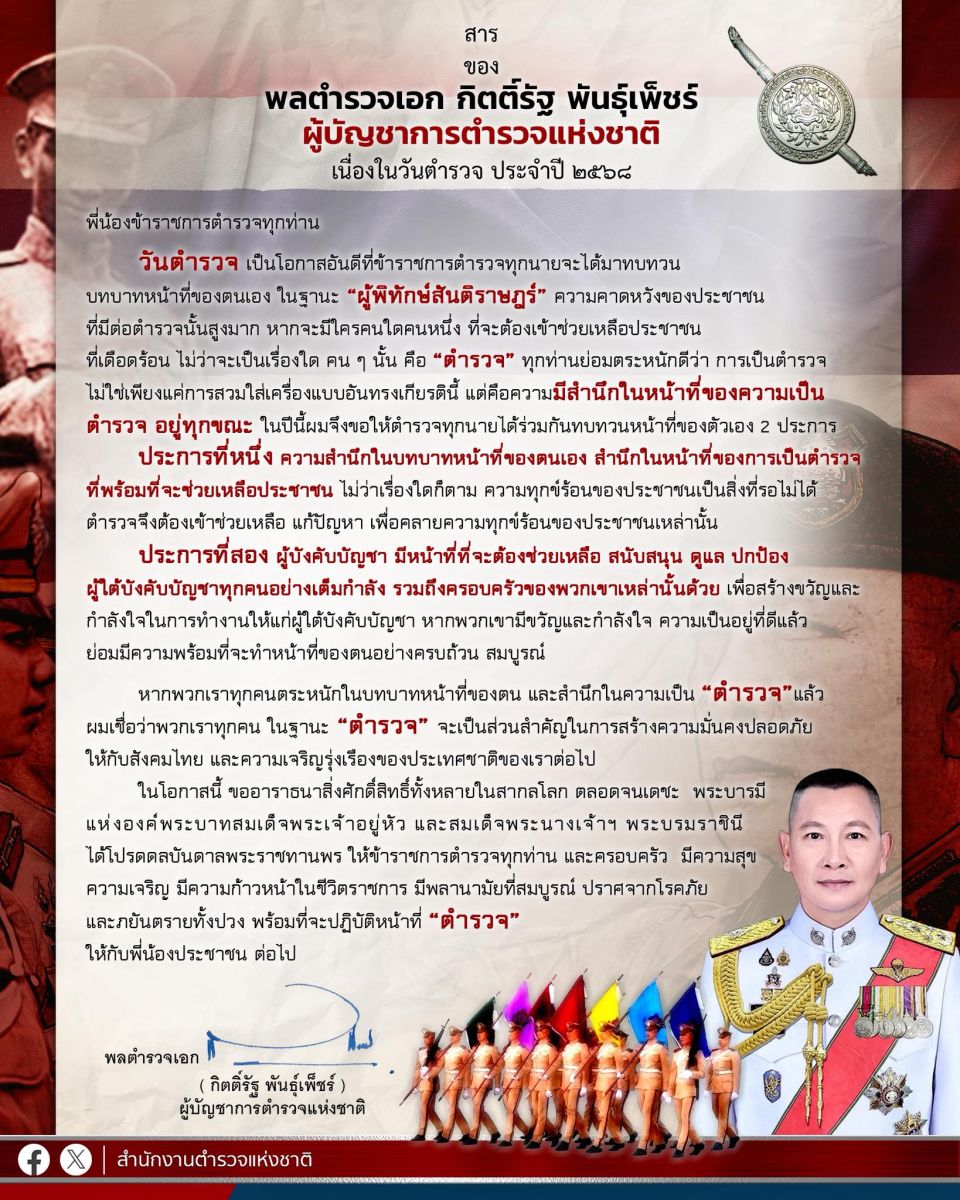 วันนี้ (16 ตุลาคม 2568) พล.ต.อ.กิตติ์รัฐ พันธุ์เพ็ชร์ ผู้บัญชาการตำรวจแห่งชาติ มีสารถึงข้าราชการตำรวจกว่า 2 แสนนาย ทั่วประเทศ เนื่องในวันตำรวจ ประจำปี 2568 ซึ่งตรงกับวันที่ 17 ตุลาคม 2568 ดังนี้
