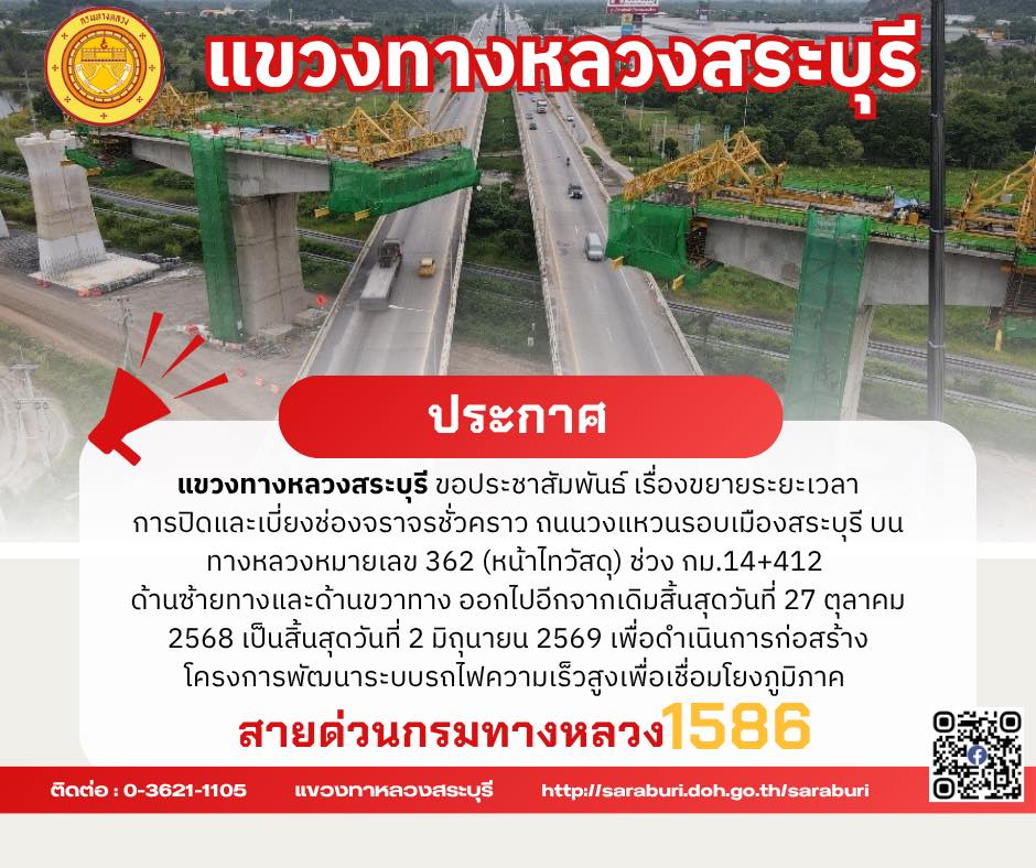 แขวงทางหลวงสระบุรี ประชาสัมพันธ์ ประชาสัมพันธ์ขยายเวลาการปิดเบี่ยงช่องจราจรชั่วคราว บนถนนวงแหวนรอบเมืองสระบุรี ทางหลวงหมายเลข 362 (หน้าไทวัสดุ) ช่วงกม.14+412 ออกไปอีกจากเดิมสิ้นสุดวันที่ 27 ตุลาคม 2568 เป็นสิ้นสุดวันที่ 2 มิถุนายน 2569