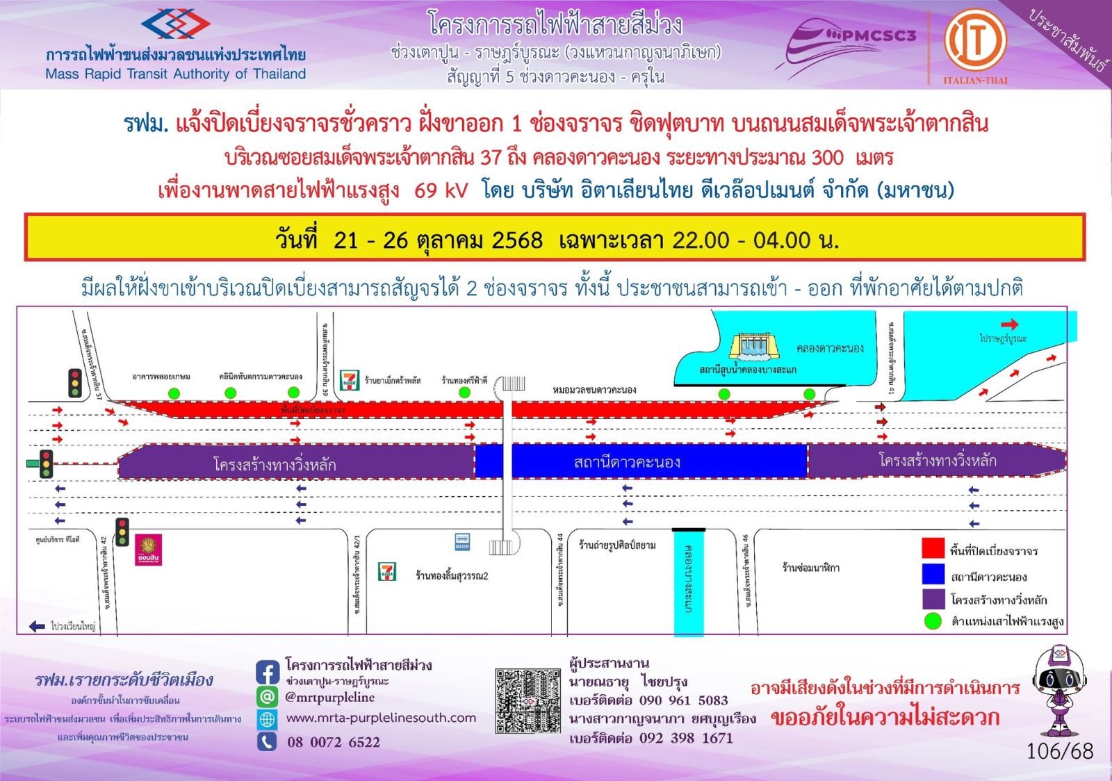 การรถไฟฟ้าขนส่งมวลชนแห่งประเทศไทย (รฟม.) แจ้งว่า บริษัท อิตาเลียนไทย ดีเวล๊อปเมนต์ จำกัด (มหาชน) ผู้รับจ้างงานก่อสร้างทางวิ่งและสถานียกระดับ อาคารจอดรถไฟฟ้าและอาคารจอดแล้วจร โครงการรถไฟฟ้าสายสีม่วง ช่วงเตาปูน - ราษฎร์บูรณะ (วงแหวนกาญจนาภิเษก) สัญญาที่ 5 ช่วงดาวคะนอง - ครุใน มีความจำเป็นต้องปิดเบี่ยงจราจรชั่วคราว ฝั่งขาออก 1 ช่องจราจร ชิดฟุตบาท บนถนนสมเด็จพระเจ้าตากสิน บริเวณซอยสมเด็จพระเจ้าตากสิน 37 ถึง คลองดาวคะนอง ระยะทางประมาณ 300 เมตร เพื่องานพาดสายไฟฟ้าแรงสูง 69 kV ในวันที่ 21 - 26 ตุลาคม 2568 เฉพาะเวลา 22.00 - 04.00 น. โดยมีผลให้ ฝั่งขาออกบริเวณปิดเบี่ยงสามารถสัญจรได้ 2 ช่องจราจร ทั้งนี้ ประชาชนสามารถเข้า-ออก ที่พักอาศัยได้ตามปกติ