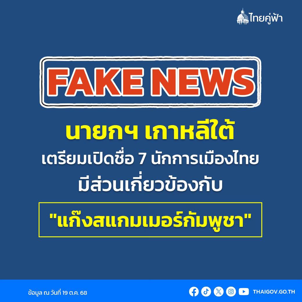 ทั้งนี้ สถานเอกอัครราชทูตสาธารณรัฐเกาหลีประจำประเทศไทย ได้ออกแถลงการณ์อย่างเป็นทางการ ระบุว่า “บทความของสำนักข่าวแห่งหนึ่ง ลงวันที่ 19 ตุลาคม 2568 ซึ่งรายงานว่านายกรัฐมนตรีเกาหลีใต้กล่าวถึงนักการเมืองไทย 7 คนที่เกี่ยวข้องกับคดีสแกมเมอร์ในกัมพูชา ไม่เป็นความจริง” พร้อมยืนยันว่ารัฐบาลเกาหลีใต้จะดำเนินการตามความเหมาะสมต่อข่าวปลอมดังกล่าว เพื่อปกป้องความถูกต้องของข้อมูลและชื่อเสียงของบุคคลที่ถูกพาดพิง