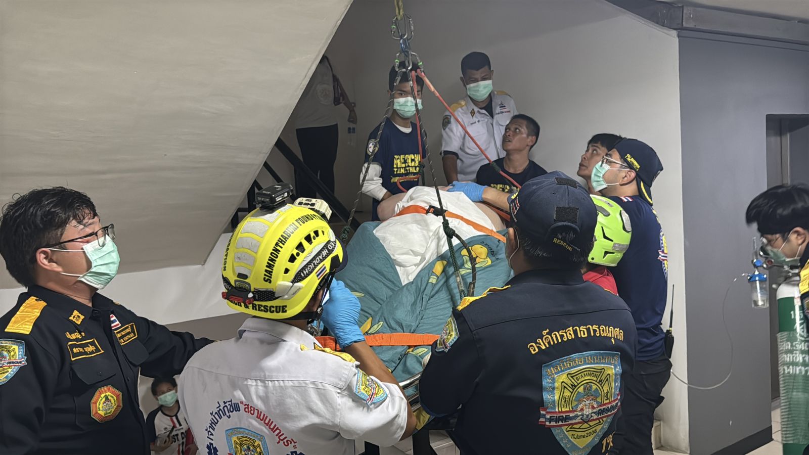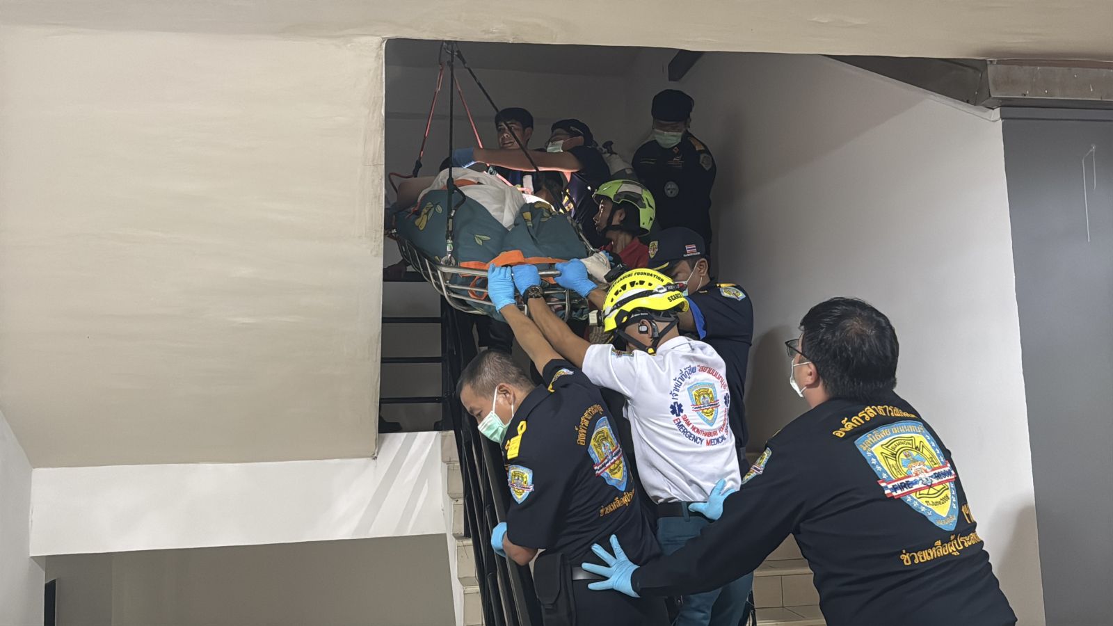 ที่เกิดเหตุเหตุเป็นอาคารสูง 8 ชั้น ผู้ป่วยพักอาศัยอยู่ที่ชั้น 5 เจ้าหน้าที่กู้ภัยได้ประเมินอาการผู้ป่วยและลิฟต์เพื่อนำผู้ป่วยลง แต่จากการตรวจสอบไม่สามารถนำผู้ป่วยลงทางลิฟต์ได้ ต้องใช้วิธีนำผู้ป่วยใส่กระเช้าเหล็กโรยตัวจากทางบันไดภายในอาคารลงมายังชั้นล่าง