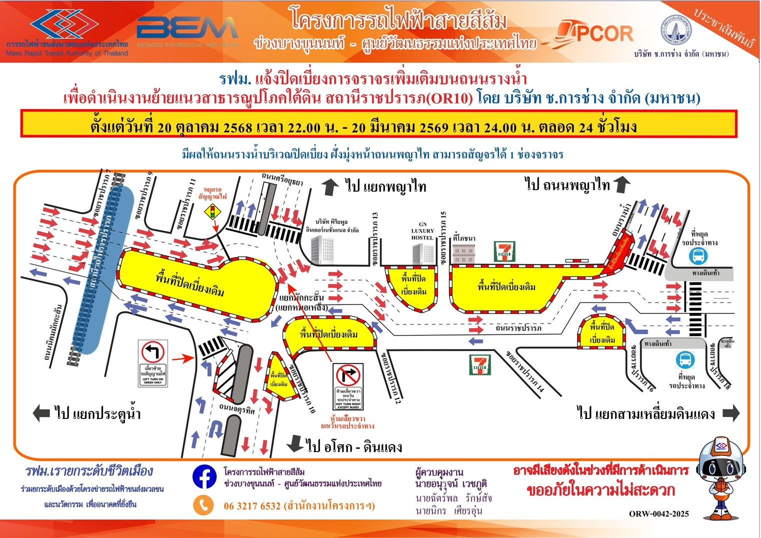 รฟม. แจ้งปิดเบี่ยงจราจรเพิ่มเติมบนถนนรางน้ำ ฝั่งมุ่งหน้าถนนพญาไท เพื่อดำเนินงานย้ายแนวสาธารณูปโภคใต้ดิน สถานีราชปรารภ (OR10) โครงการรถไฟฟ้าสายสีส้ม ช่วงบางขุนนนท์ – ศูนย์วัฒนธรรมแห่งประเทศไทย ตั้งแต่วันที่ 20 ตุลาคม 2568 เวลา 22.00 น. – 20 มีนาคม 2569 เวลา 24.00 น. ตลอด 24 ชั่วโมง