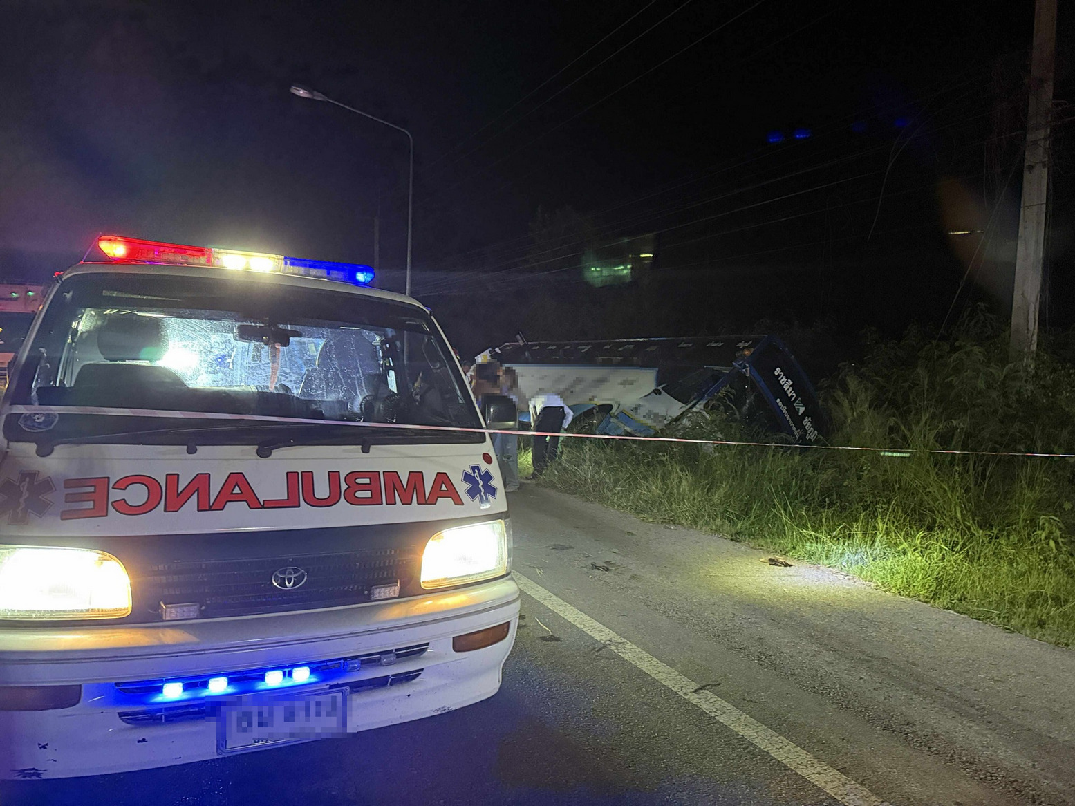 รถทัวร์เสียหลักตกข้างทาง ริมถนนสุรนารายณ์ มีผู้บาดเจ็บหลายราย จ.นครราชสีมา