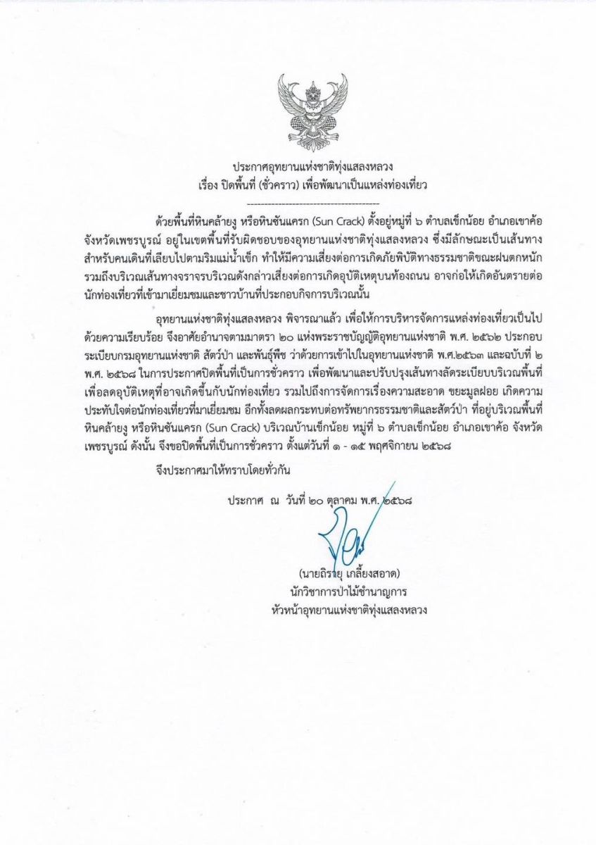 ทั้งนี้ ที่ประชุมได้มีมติให้อุทยานแห่งชาติทุ่งแสลงหลวง ปิดพื้นที่ (ชั่วคราว) ตั้งแต่วันที่ 1 - 15 พฤศจิกายน 2568 เพื่อดำเนินการพัฒนาพื้นที่ให้เป็นเส้นทางศึกษาธรรมชาติ และแหล่งท่องเที่ยวทางธรรมชาติสำหรับนักท่องเที่ยวสายมู