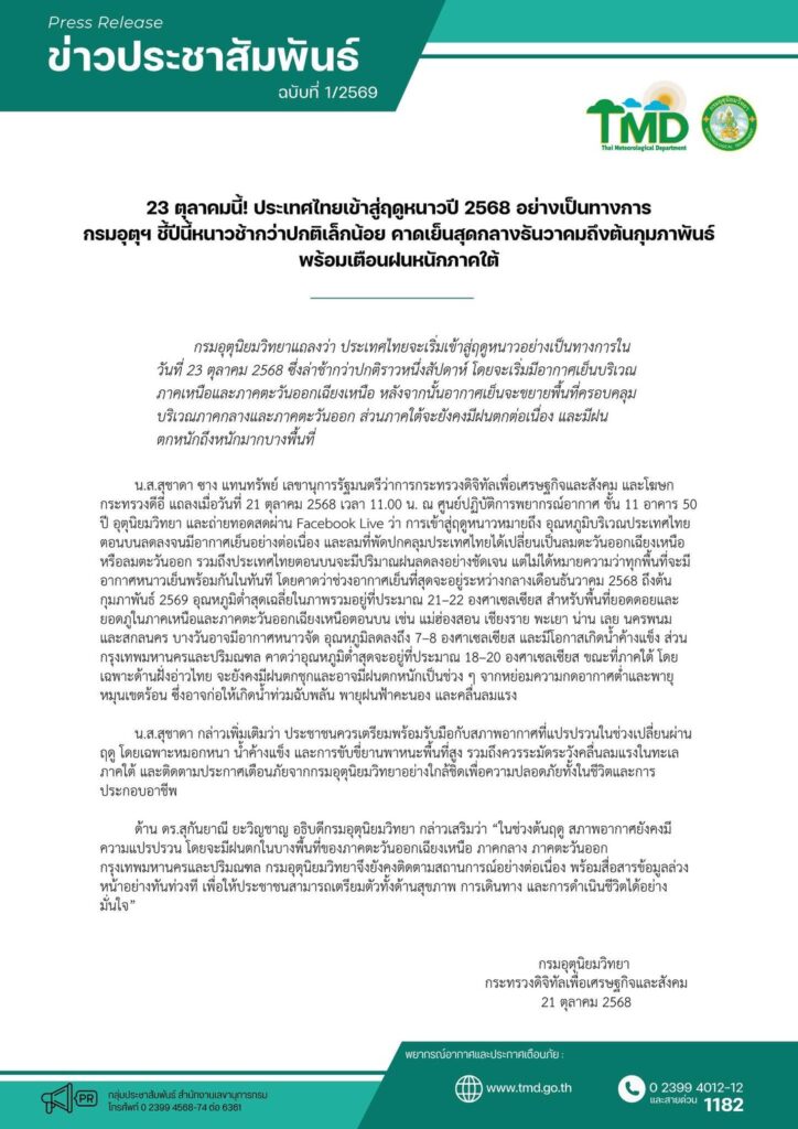 กรมอุตุนิยมวิทยาแถลงว่า ประเทศไทยจะเริ่มเข้าสู่ฤดูหนาวอย่างเป็นทางการในวันที่ 23 ตุลาคม 2568 ซึ่งล่าช้ากว่าปกติราวหนึ่งสัปดาห์ โดยจะเริ่มมีอากาศเย็นบริเวณภาคเหนือและภาคตะวันออกเฉียงเหนือ หลังจากนั้นอากาศเย็นจะขยายพื้นที่ครอบคลุมบริเวณภาคกลางและภาคตะวันออก ส่วนภาคใต้จะยังคงมีฝนตกต่อเนื่อง และมีฝนตกหนักถึงหนักมากบางพื้นที่