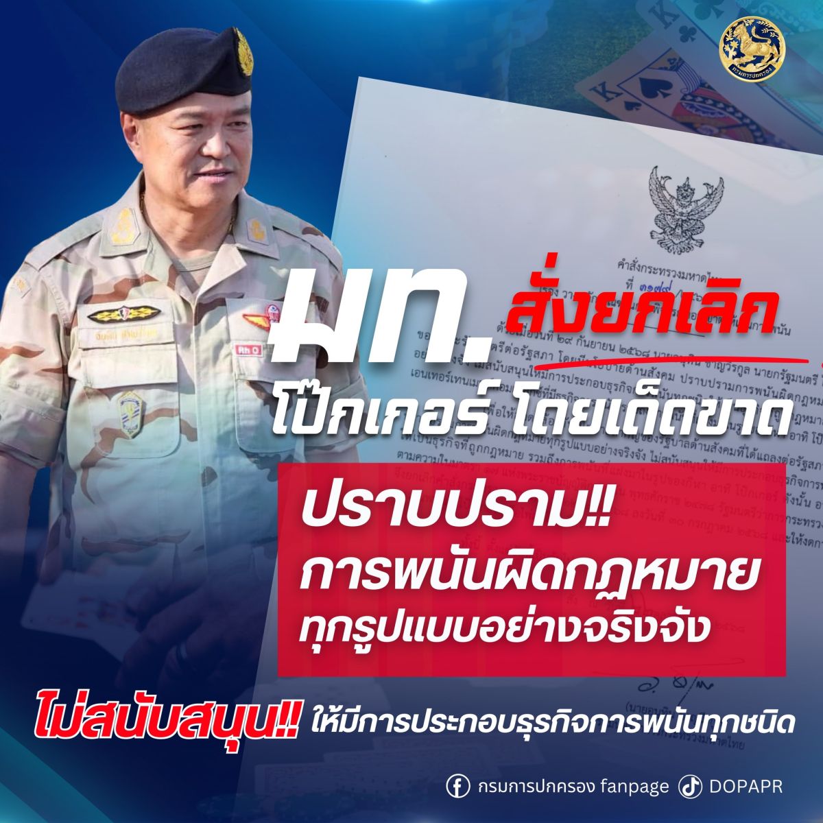 เพื่อให้การดำเนินงานของกระทรวงมหาดไทยสอดคล้องกับนโยบายสำคัญดังกล่าว รัฐมนตรีว่าการกระทรวงมหาดไทยจึงอาศัยอำนาจตามมาตรา 17 แห่งพระราชบัญญัติการพนัน พุทธศักราช 2478 ยกเลิกคำสั่งกระทรวงมหาดไทยที่ 2253/2568 ลงวันที่ 30 กรกฎาคม 2568 ให้งดการอนุญาตให้มีการเล่นการพนันโป๊กเกอร์ หรือไพ่เผ โดยเด็ดขาด