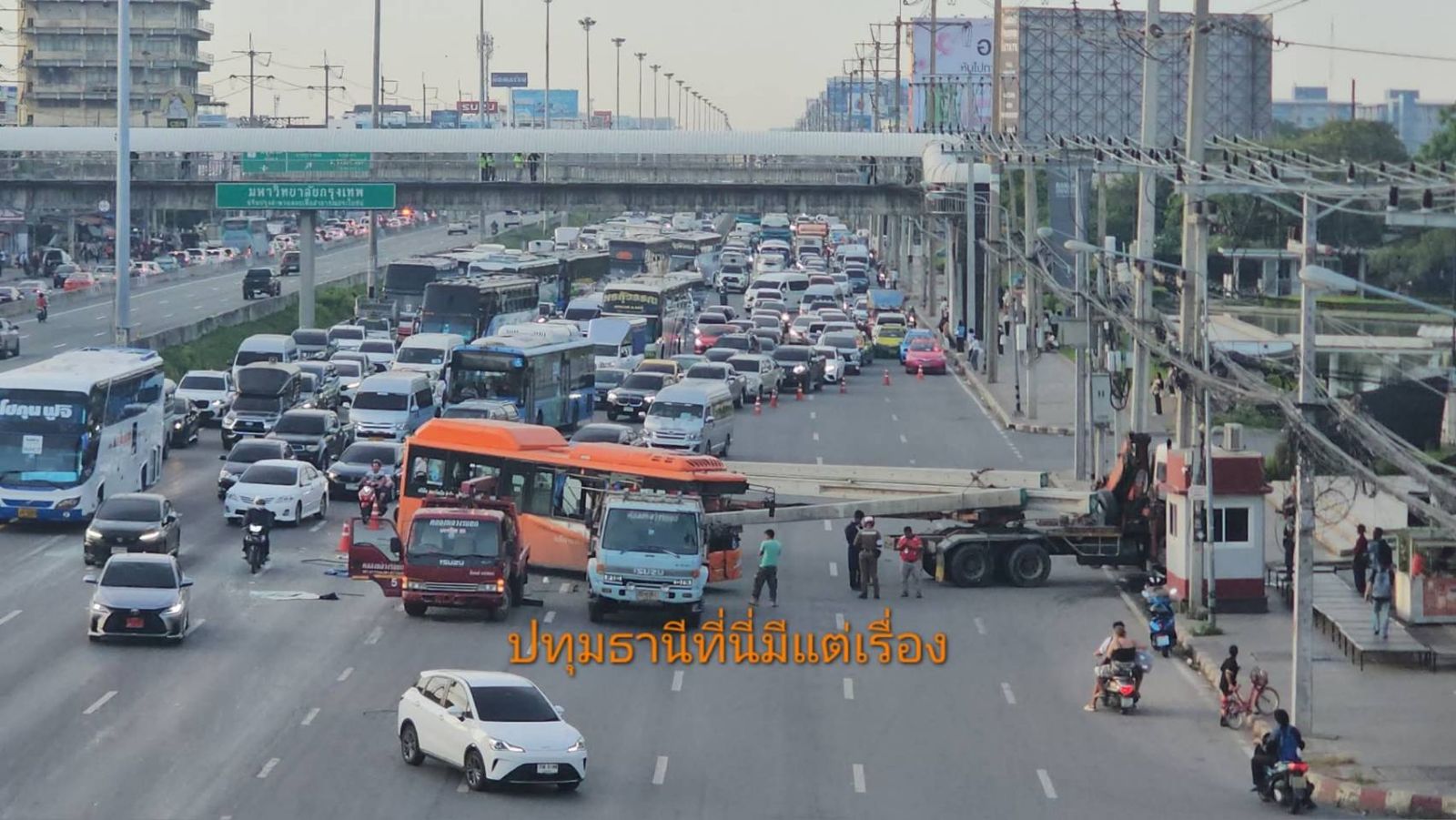 อุบัติเหตุ เมื่อเวลาประมาณ 05.00 น. วันที่ 23 ตุลาคม 2568 รถประจำทางปรับอากาศ ชนท้ายรถพ่วงบรรทุกเสาเข็ม หน้ามหาวิทยาลัยกรุงเทพ ถนนพหลโยธิน ขาออก พื้นที่ สภ.คลองหลวง จังหวัดปทุมธานี ส่งผลให้การจราจรเช้านี้ติดขัดมาก