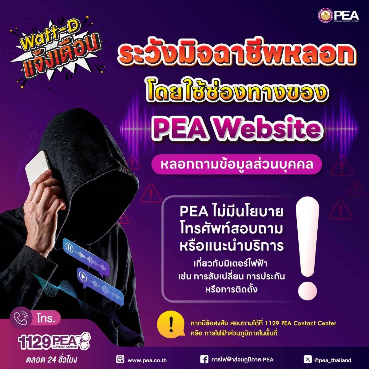 การไฟฟ้าส่วนภูมิภาค (PEA) เตือนประชาชนให้ระวังมิจฉาชีพแอบอ้างชื่อ PEA โดยใช้ช่องทางเว็บไซต์หรือสื่อออนไลน์ ปลอมแปลงเป็นหน้าเว็บไซต์ของ PEA เพื่อหลอกถามข้อมูลส่วนบุคคล เช่น ชื่อ ที่อยู่ หมายเลขบัตรประชาชน หรือข้อมูลทางการเงิน
