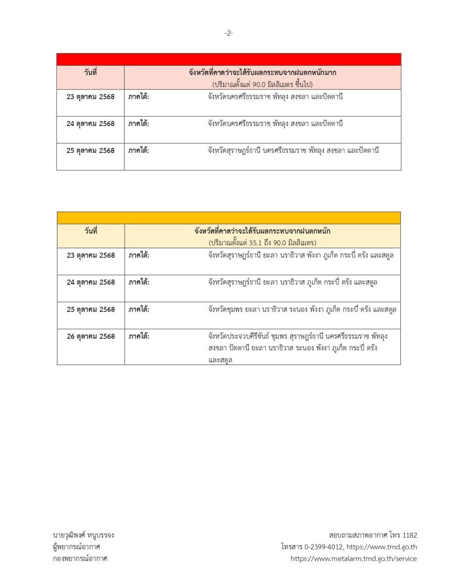 ส่งผลให้ในวันที่ 23 ต.ค. 68 ภาคตะวันออกเฉียงเหนือ มีฝนฟ้าคะนองบางแห่ง สำหรับภาคใต้มีฝนตกหนักถึงหนักมากบางแห่งในช่วงวันที่ 23-26 ต.ค. 68 เนื่องจากร่องมรสุมกำลังปานกลางพาดผ่านภาคใต้ตอนกลาง ประกอบกับมรสุมตะวันออกเฉียงเหนือพัดปกคลุมอ่าวไทยและภาคใต้ ขอให้ประชาชนในบริเวณดังกล่าวระวังอันตรายจากฝนตกหนักถึงหนักมาก ซึ่งอาจทำให้เกิดน้ำท่วมฉับพลัน น้ำป่าไหลหลาก และน้ำล้นตลิ่ง โดยเฉพาะพื้นที่ลาดเชิงเขาใกล้ทางน้ำไหลผ่าน พื้นที่ลุ่ม และพื้นที่น้ำท่วมขัง