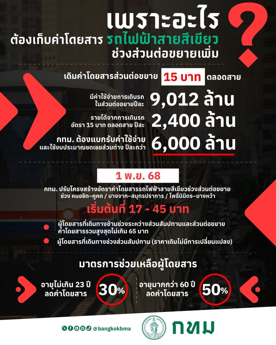 วันที่ 1 พ.ย. 68 กทม. ปรับโครงสร้างอัตราค่าโดยสารรถไฟฟ้าสายสีเขียวช่วงส่วนต่อขยาย ช่วงหมอชิต-คูคต / บางจาก-สมุทรปราการ / โพธิ์นินิมิตร-บางหว้า เริ่มต้นที่ 17 - 45 บาท