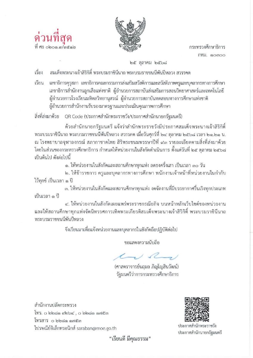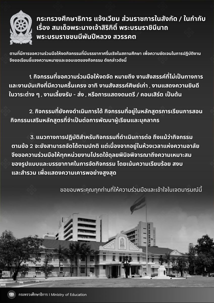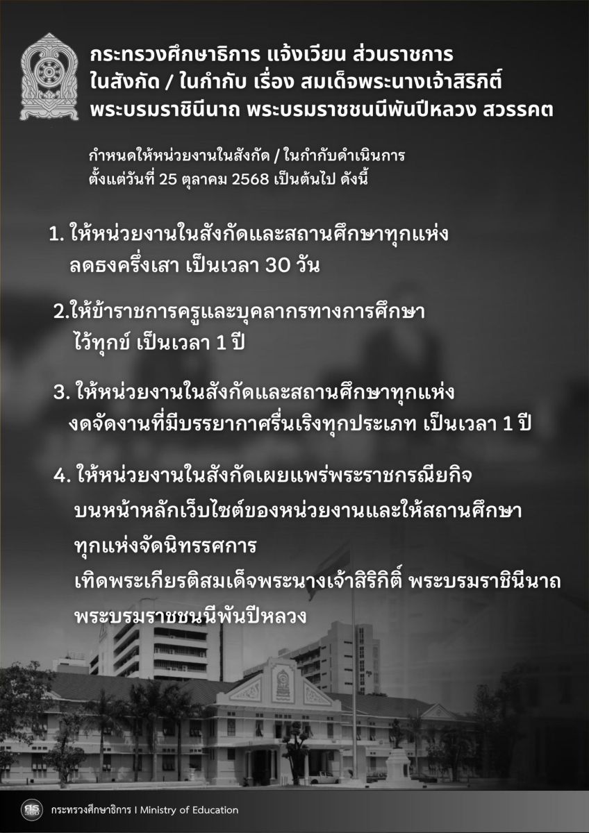 กระทรวงศึกษาธิการ มีหนังสือด่วนที่สุด เรื่อง สมเด็จพระนางเจ้าสิริกิติ์ พระบรมราชินีนาถ พระบรมราชชนนีพันปีหลวง สวรรคต กำหนดให้หน่วยงานในสังกัด/ในกำกับดำเนินการ ตั้งแต่วันที่ 25 ตุลาคม 2568 เป็นต้นไป ดังนี้