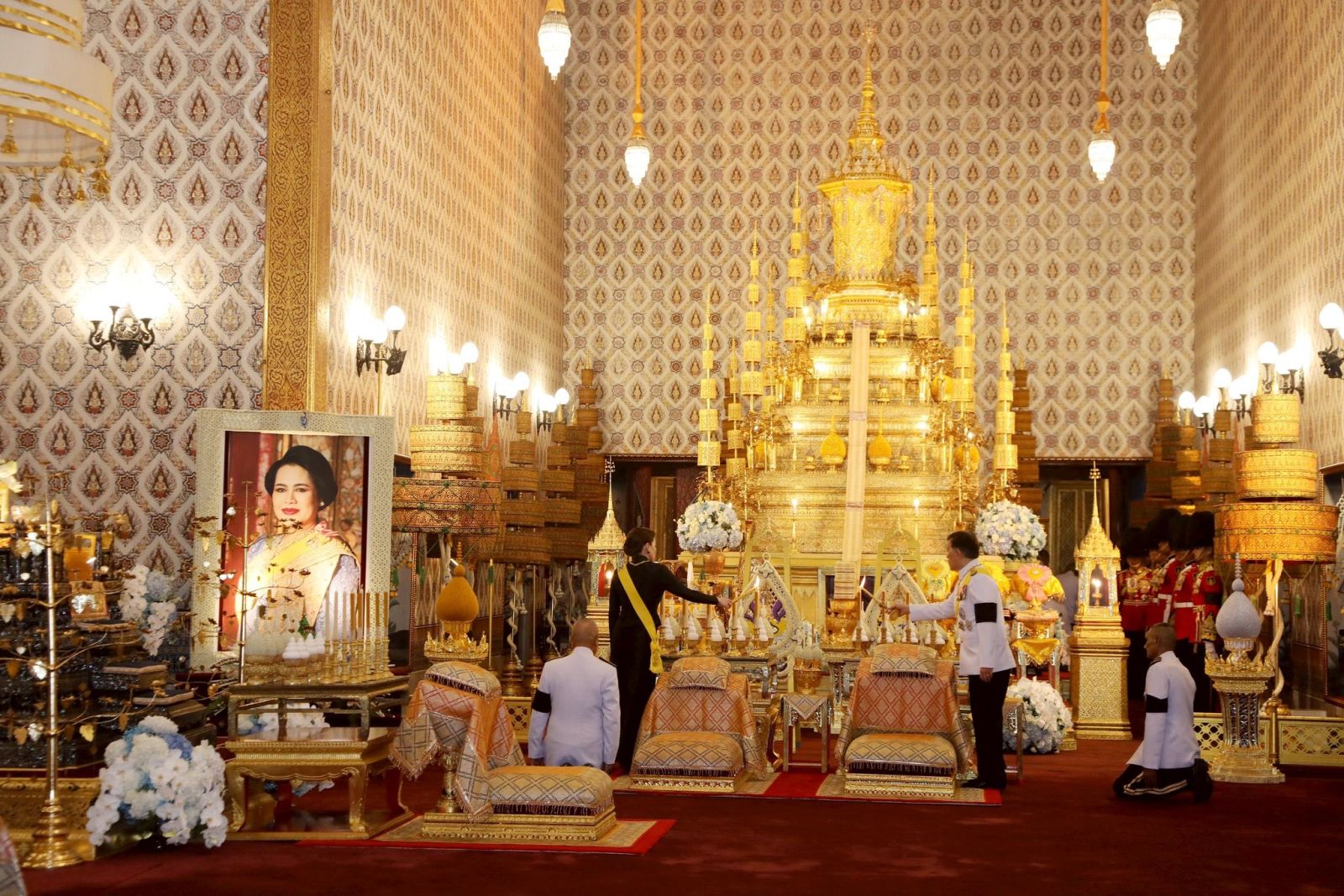 หน้าพระแท่นพระนพปฎลมหาเศวตฉัตร ทรงกราบ พระบาทสมเด็จพระเจ้าอยู่หัว และสมเด็จพระนางเจ้า ฯ พระบรมราชินี เสด็จพระราชดำเนินไปหน้าพระโกศพระบรมศพ ทรงกราบ ทรงรับการถวายความเคารพของผู้มาเฝ้าทูลละอองธุลีพระบาท จากนั้น เสด็จลงจากพระที่นั่งดุสิตมหาปราสาท ประทับรถยนต์พระที่นั่ง เสด็จพระราชดำเนินกลับ