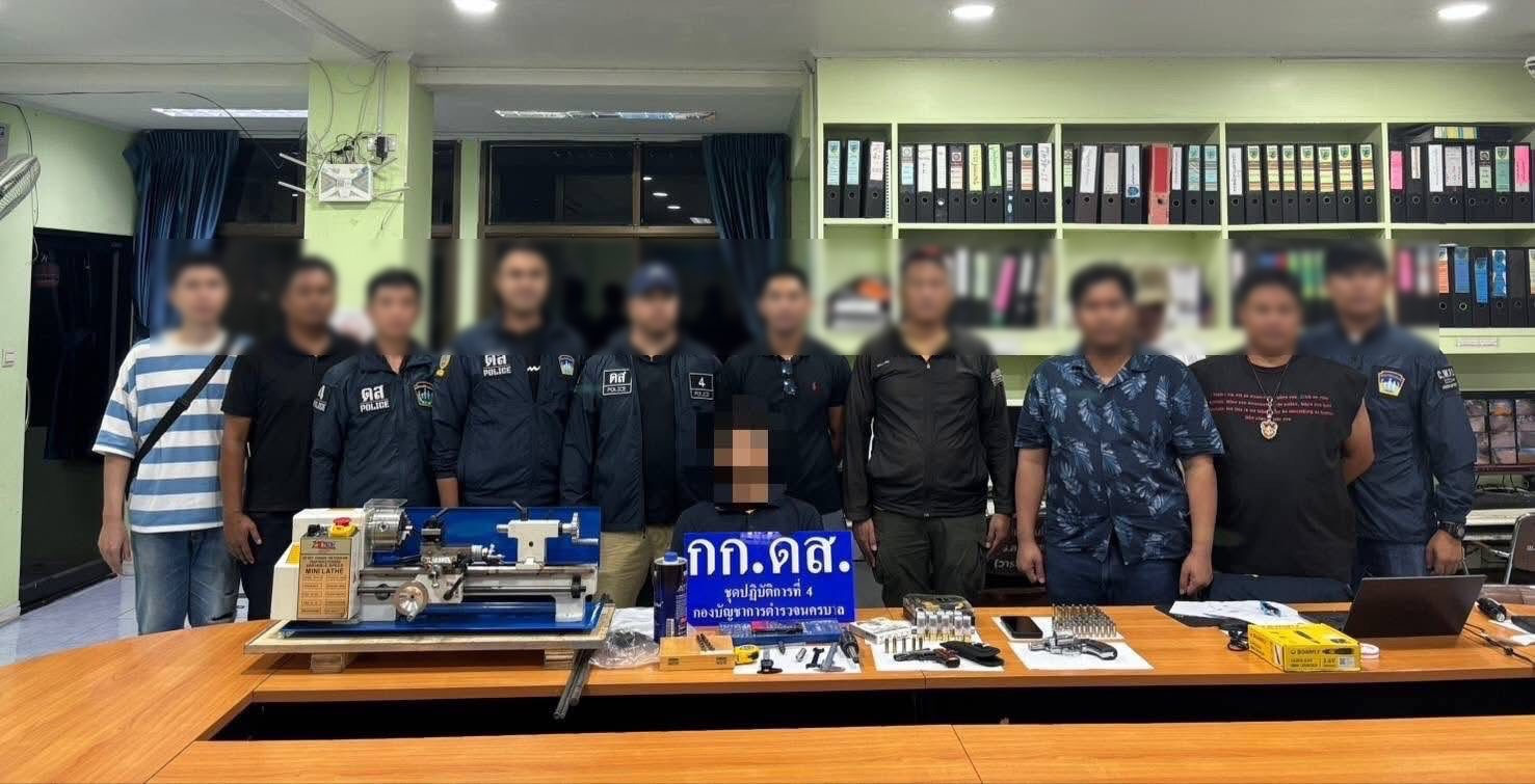 ตำรวจ ดส.นำกำลังบุกหน้าโรงแรมแห่งหนึ่งในพัทยา ก่อนจับกุมชายวัย 26 ปี ลอบผลิตปืนไทยประดิษฐ์ขาย ยึดของกลางปืนและกระสุนจำนวนมาก