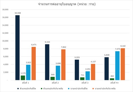 ทั้งนี้ จากสถิติการขอรับและต่ออายุใบอนุญาตตัวแทน-นายหน้าประกันภัยในช่วง 6 เดือนแรกของปี 2568 (มกราคม – มิถุนายน 2568) พบว่า มีผู้ยื่นคำขอรับและต่ออายุใบอนุญาต รวมทั้งสิ้นจำนวน 129,606 ราย เพิ่มขึ้น +944 รายจากช่วงเวลาเดียวกันของปีก่อน คิดเป็น 0.73% แบ่งเป็นการขอรับใบอนุญาตใหม่ จำนวน 46,987 ราย ประกอบด้วย ตัวแทนประกันชีวิตจำนวน 32,907 ราย ตัวแทนประกันวินาศภัยจำนวน 1,474 ราย นายหน้าประกันชีวิตจำนวน 5,499 ราย และนายหน้าประกันวินาศภัยจำนวน 7,107 ราย การต่ออายุใบอนุญาตของตัวแทนและนายหน้าประกันภัย รวมทั้งสิ้น 85,807 ราย