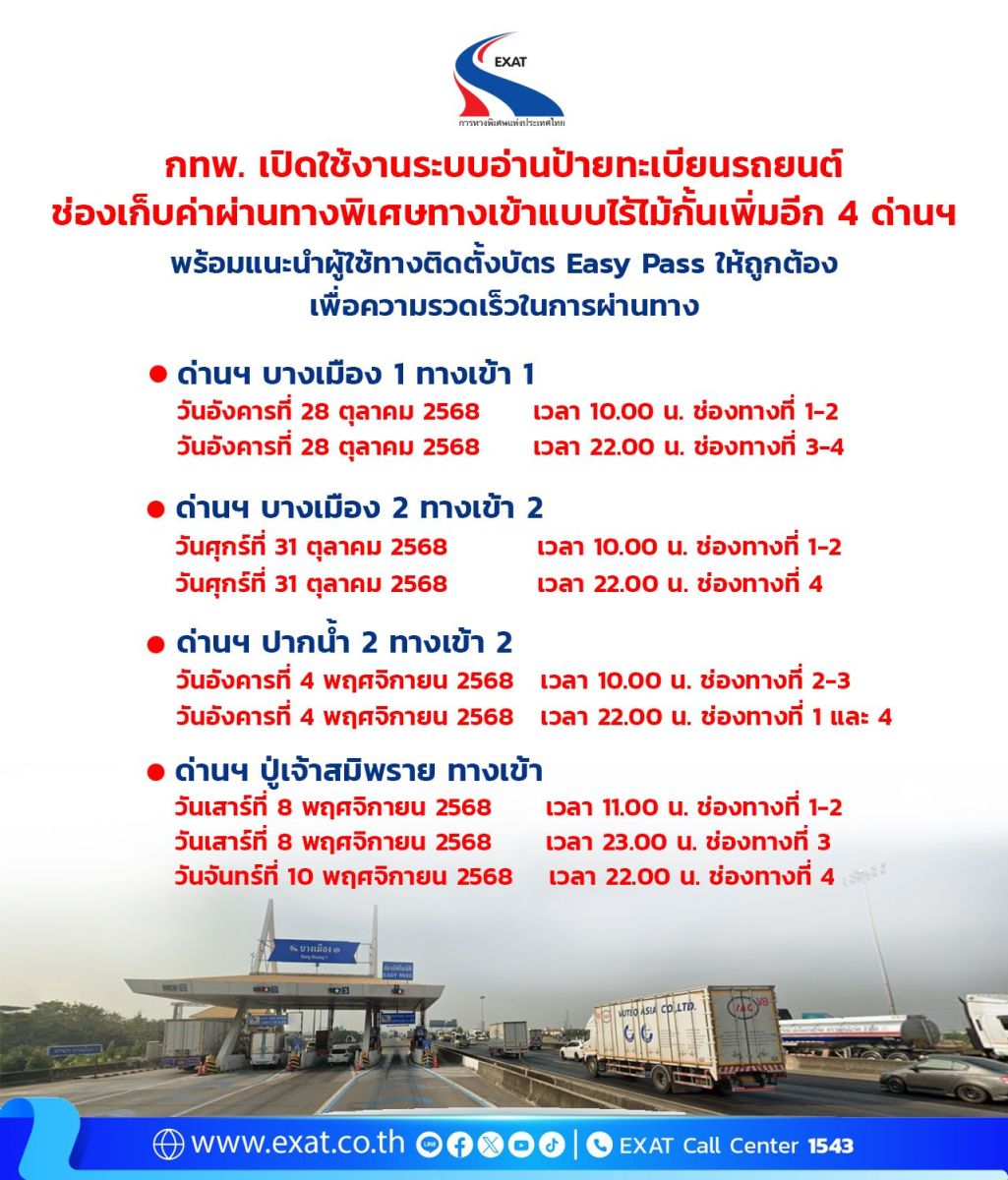 กทพ. เปิดใช้งานระบบอ่านป้ายทะเบียนรถยนต์ ช่องเก็บค่าผ่านทางพิเศษทางเข้าแบบไร้ไม้กั้นเพิ่มอีก 4 ด่านฯ พร้อมแนะนำผู้ใช้ทางติดตั้งบัตร Easy Pass ให้ถูกต้อง เพื่อความรวดเร็วในการผ่านทาง