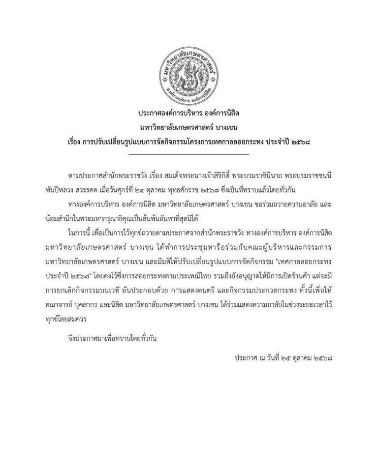 31 ต.ค.68 องค์การบริหาร องค์การนิสิตมหาวิทยาลัยเกษตรศาสตร์ (บางเขน) แจ้งการจัดงานลอยกระทงปีนี้ จัดขึ้น 2 วันคือ วันที่ 4-5 พ.ย. 68