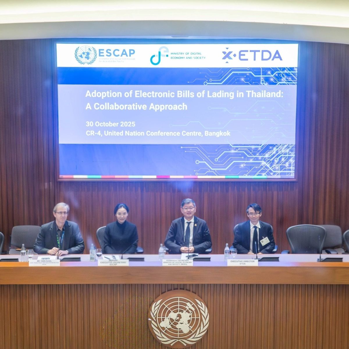 วันที่ 30 ตุลาคม 2568 นายพชร อนันตศิลป์ ปลัดกระทรวงดิจิทัลเพื่อเศรษฐกิจและสังคม (ดีอี) เป็นประธานในพิธีเปิดการสัมมนา “Workshop on the Adoption of Electronic Bills of Lading (eBL) in Thailand: A Collaborative Approach” ซึ่งจัดขึ้นโดย คณะกรรมาธิการเศรษฐกิจและสังคมแห่งสหประชาชาติประจำภูมิภาคเอเชียและแปซิฟิก (ESCAP) ร่วมกับสำนักงานพัฒนาธุรกรรมทางอิเล็กทรอนิกส์ (สพธอ.) หรือ ETDA โดยมี Ms. Lin Yang รองเลขาธิการบริหาร ESCAP นายชัยชนะ มิตรพันธ์ ผู้อำนวยการ ETDA และผู้ที่เกี่ยวข้อง เข้าร่วม ณ ศูนย์การประชุมสหประชาชาติ กรุงเทพฯ