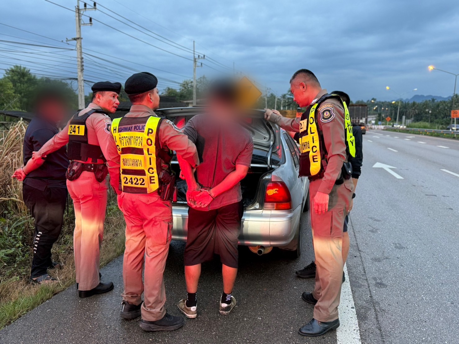 พล.ต.ต.พรศักดิ์ เลารุจิราลัย ผบก.ทล. พร้อมกำลังเจ้าหน้าที่ตำรวจทางหลวง ส.ทล.4 กก.2 บก.ทล. (ชุมพร-ระนอง) , เจ้าหน้าที่ตำรวจทางหลวง ส.ทล.5 กก.2 บก.ทล.(สุราษฎร์ธานี) ร่วมกันจับกุมผู้ต้องหา