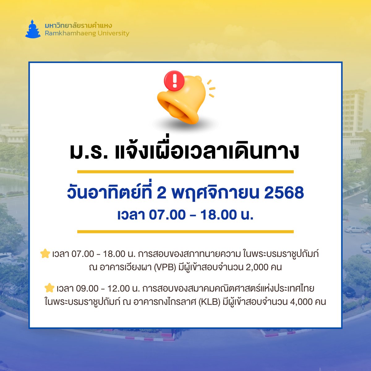 วันอาทิตย์ที่ 2 พฤศจิกายน 2568 ตั้งแต่เวลา 07.00 - 18.00 น. มหาวิทยาลัยรามคำแหง ณ อาคารกงไกรลาศ และอาคารเวียงผา